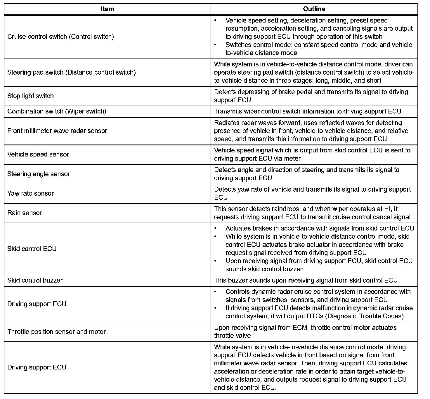 e. In vehicle-to-vehicle distance control mode, the dynamic radar cruise control system receives signals from the yaw rate (deceleration) sensor and the steering angle sensor. Based on these signals, it then estimates curve radius and compensates for information on the preceding vehicle while turning. It can also compensate for the brake control when approaching another vehicle.
