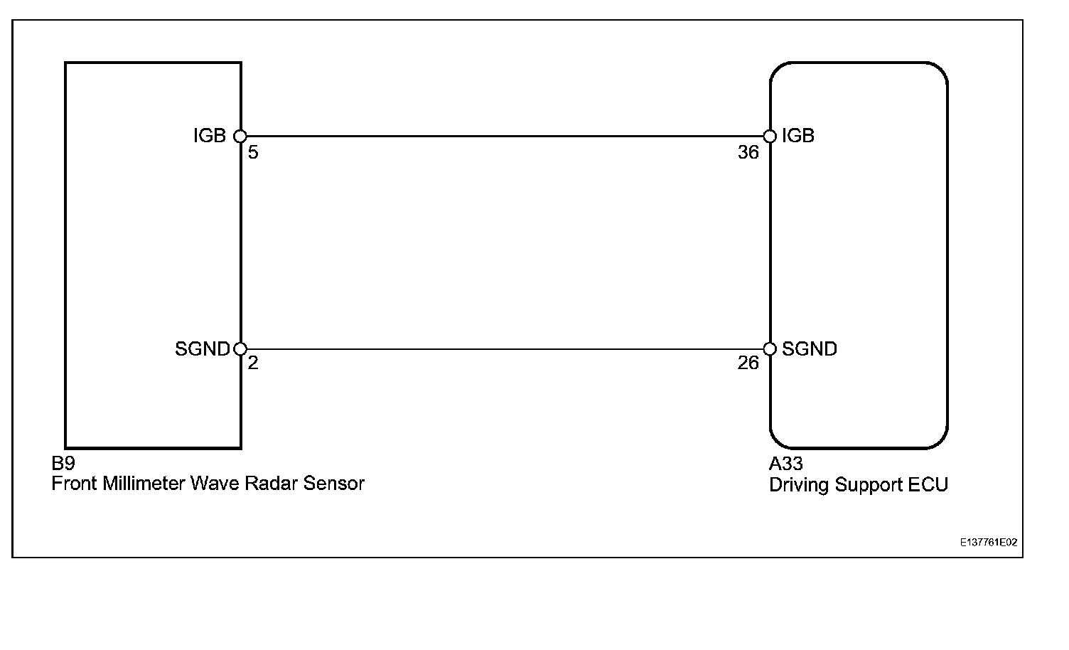 This circuit provides power to the front millimeter wave radar sensor. The front millimeter wave radar sensor emits radio waves towards an object in front and measures the distance and direction of the object by receiving the beam reflections. Based on the reflections, the sensor calculates the difference in speed between the vehicle and the object in front. This data is transmitted to the driving support ECU.
