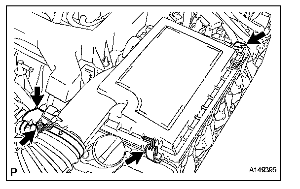 b. Remove the 2 clamps, loosen the hose clamp and remove the air cleaner cap RH.