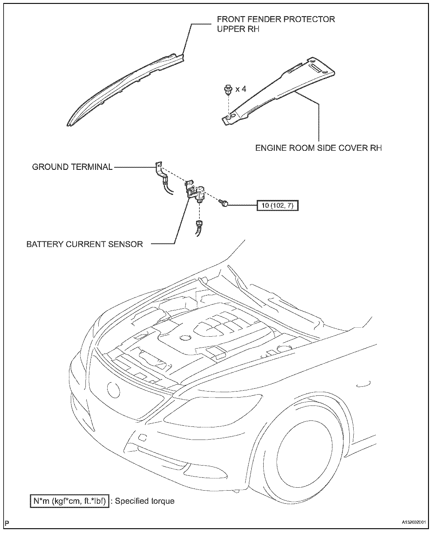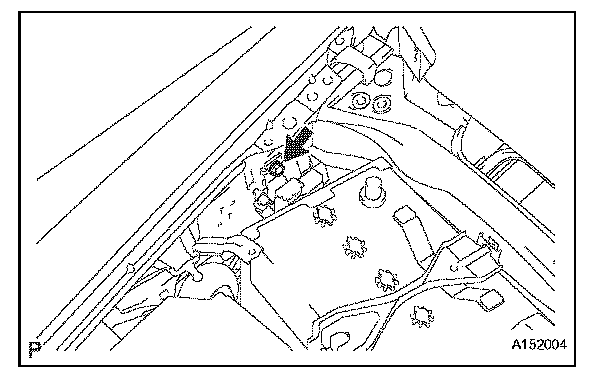b. Hook the bracket onto the hole on the engine room body, and install the battery current sensor assembly with the bolt.