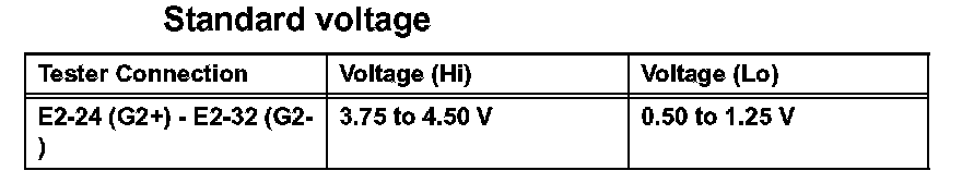 c. While turning the crankshaft pulley by hand, measure the voltage between each terminal. Check that the voltage changes between the Hi range and Lo range given in the table.