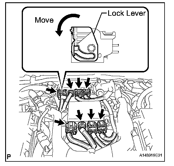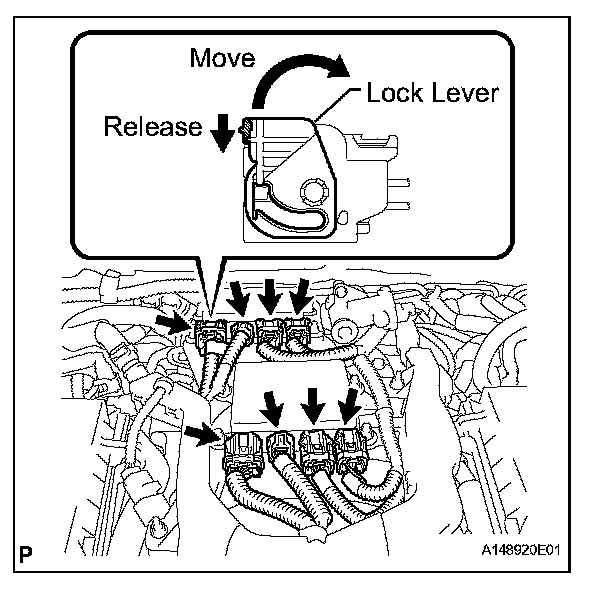 1. Disconnect the 6 connectors with wire harness locks and the 2 connectors without wire harness locks from the 2 injector drivers.