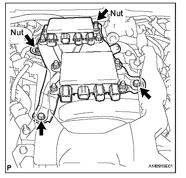 b. Remove the 2 bolts, 2 nuts and 2 injector drivers with bracket.