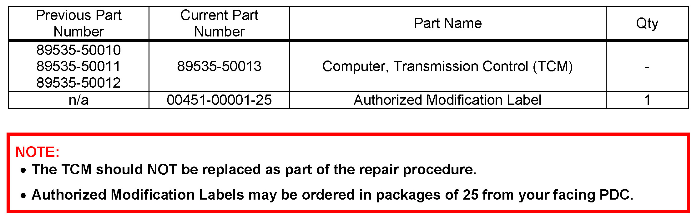 1. Check for the Authorized Modifications Label affixed to the vehicle in the location shown in Figure 1.Confirm if the TCM calibration has been updated. If the calibration ID listed is NOT the latest TCM calibration - go to step 2.