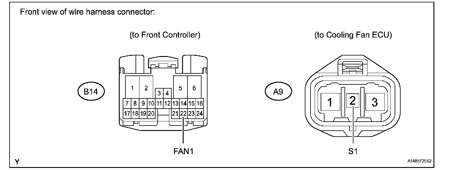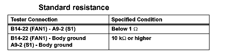 (c) Check the resistance of the wire harness between the front controller B14-22 (FAN1) and cooling fan ECU A9-2 (S1).