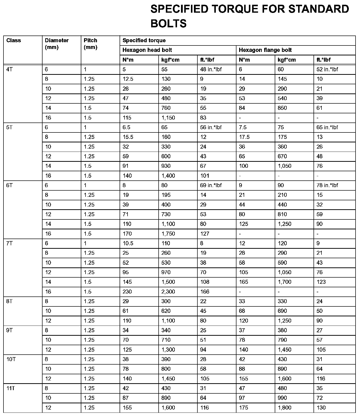 Standard Bolt - Specified Torque For Standard Bolts: