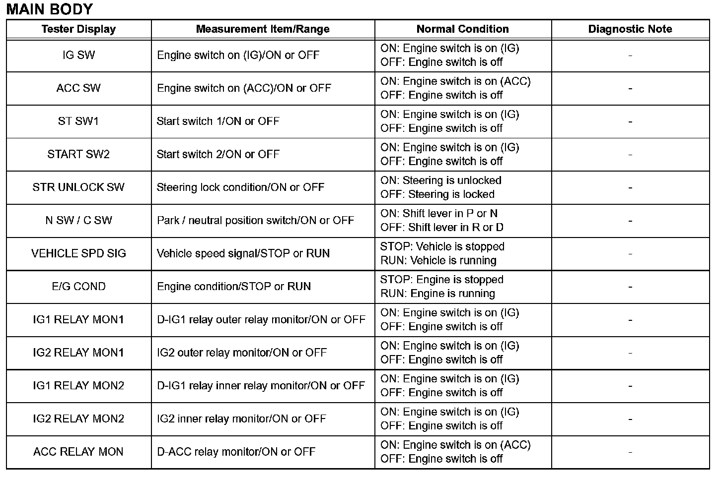 READ DATA LISTHINT: Using the intelligent tester or Techstream to read the Data List allows the values or states of switches, sensors, actuators and other items to be read without removing any parts. This non-intrusive inspection can be very useful because intermittent conditions or signals may be discovered before parts or wiring is disturbed. Reading the Data List information early in troubleshooting is one way to save diagnostic time.