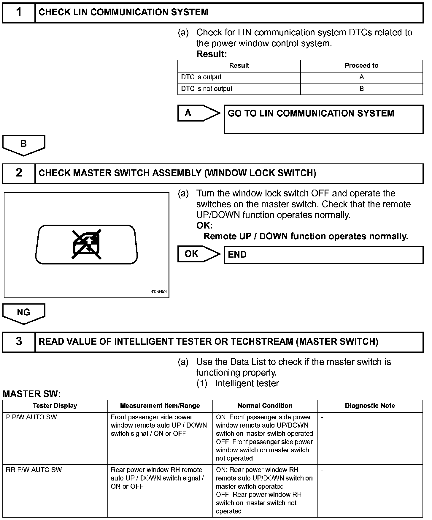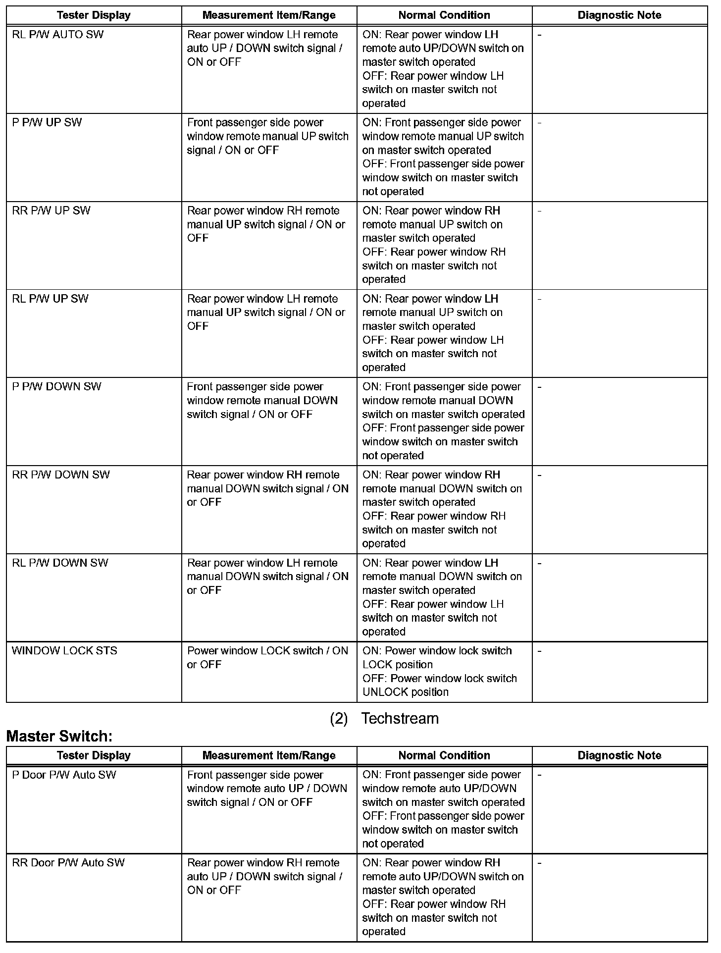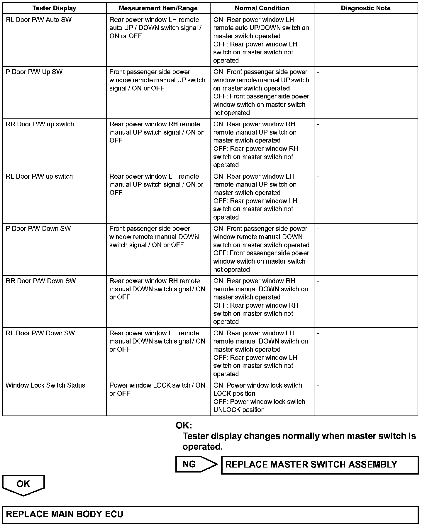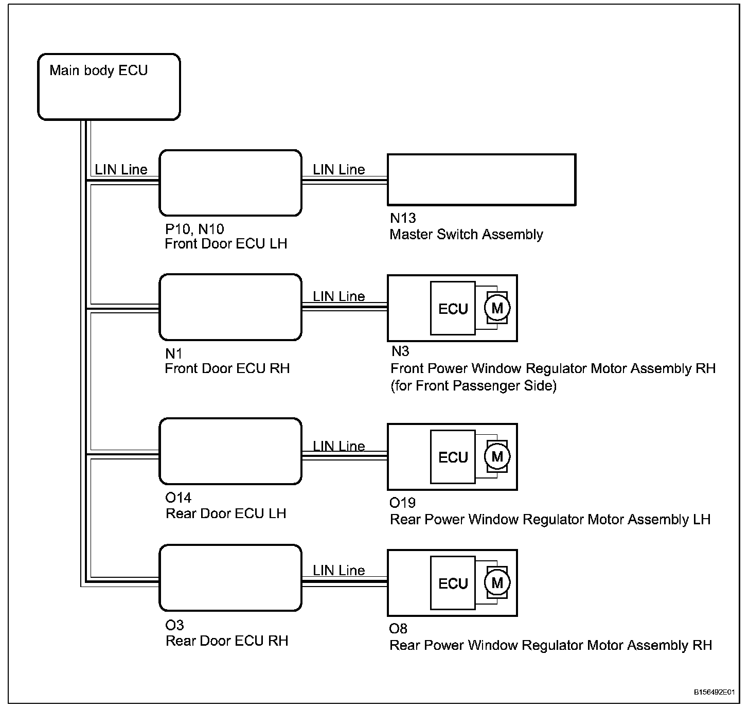 When the engine switch is on (IG) and window lock switch is OFF, the master switch sends remote UP / DOWN signal to each power window regulator motor via the LIN communication line.