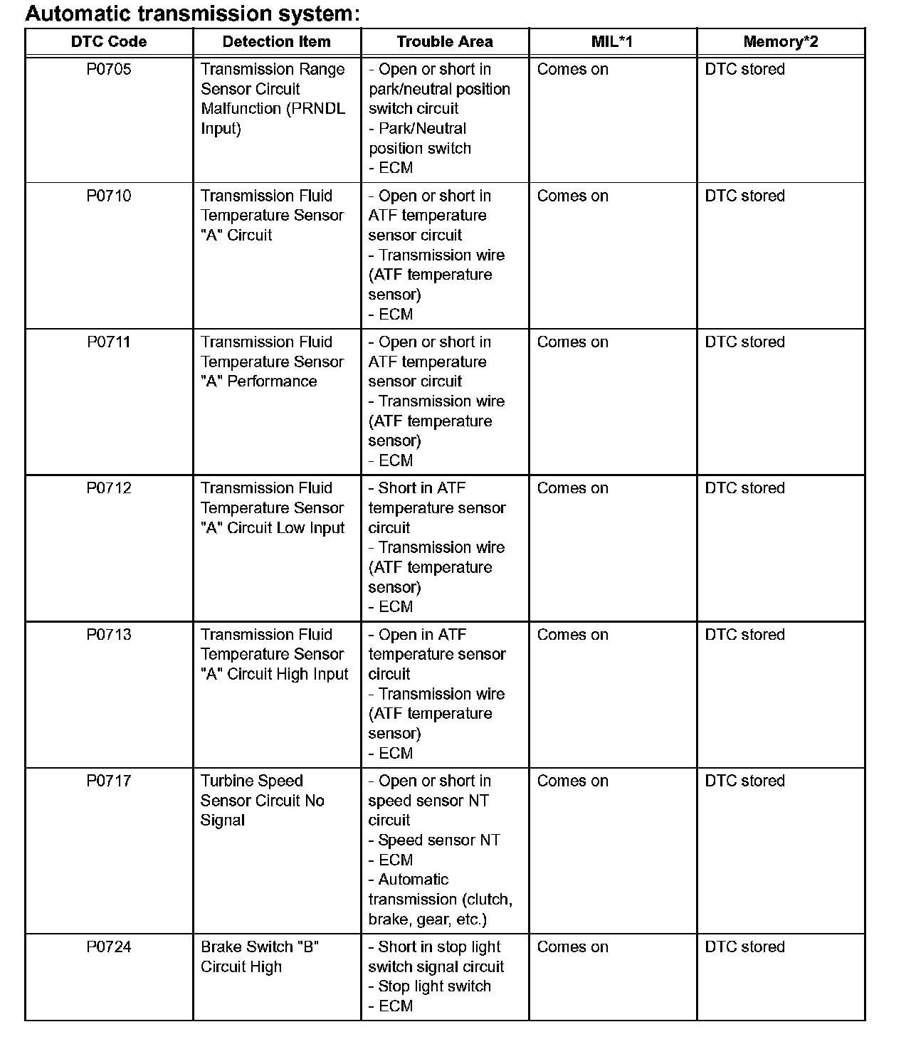 ^ *2: "DTC stored" means the ECM memorizes the malfunction code if the ECM detects the DTC detection condition.