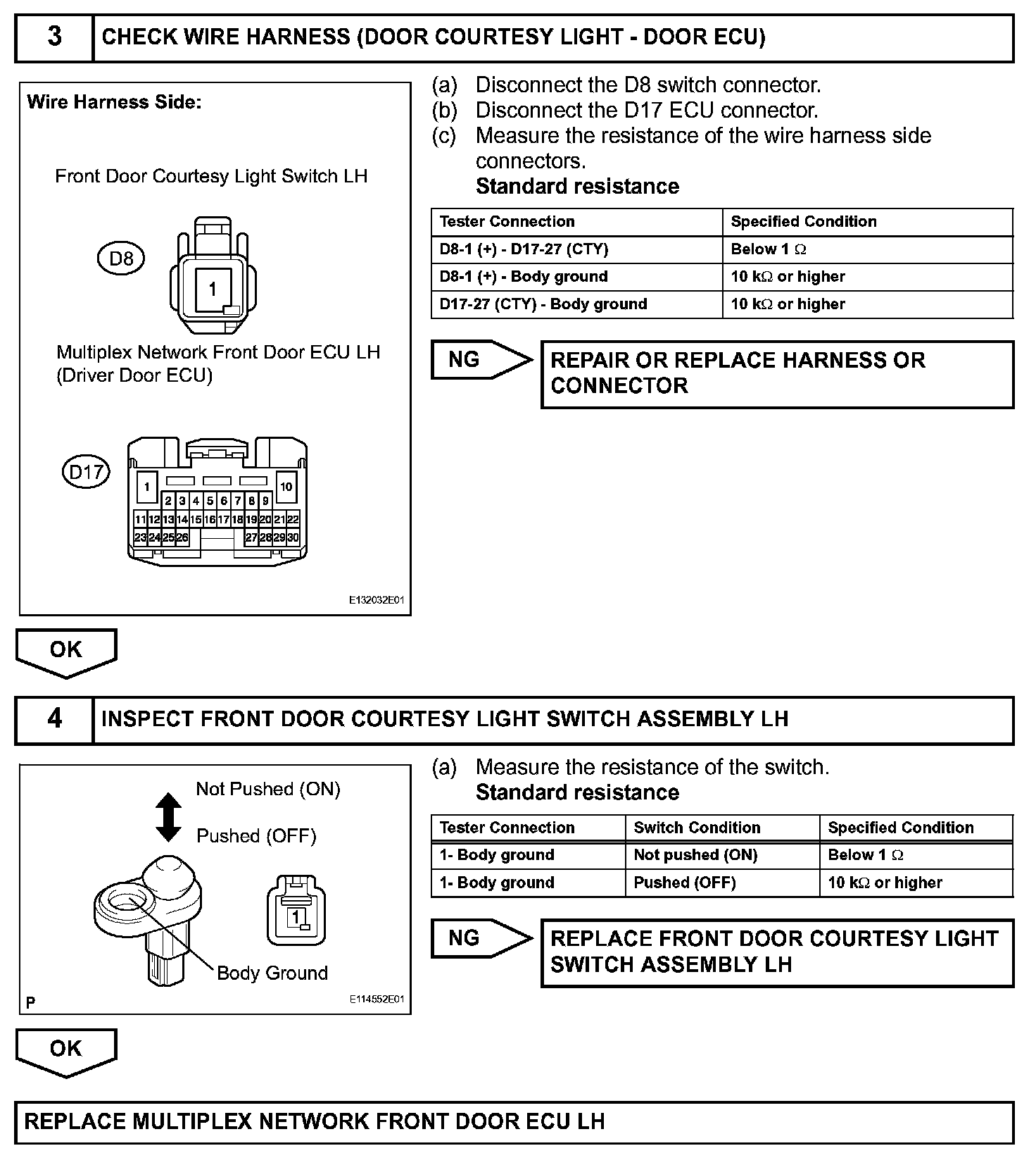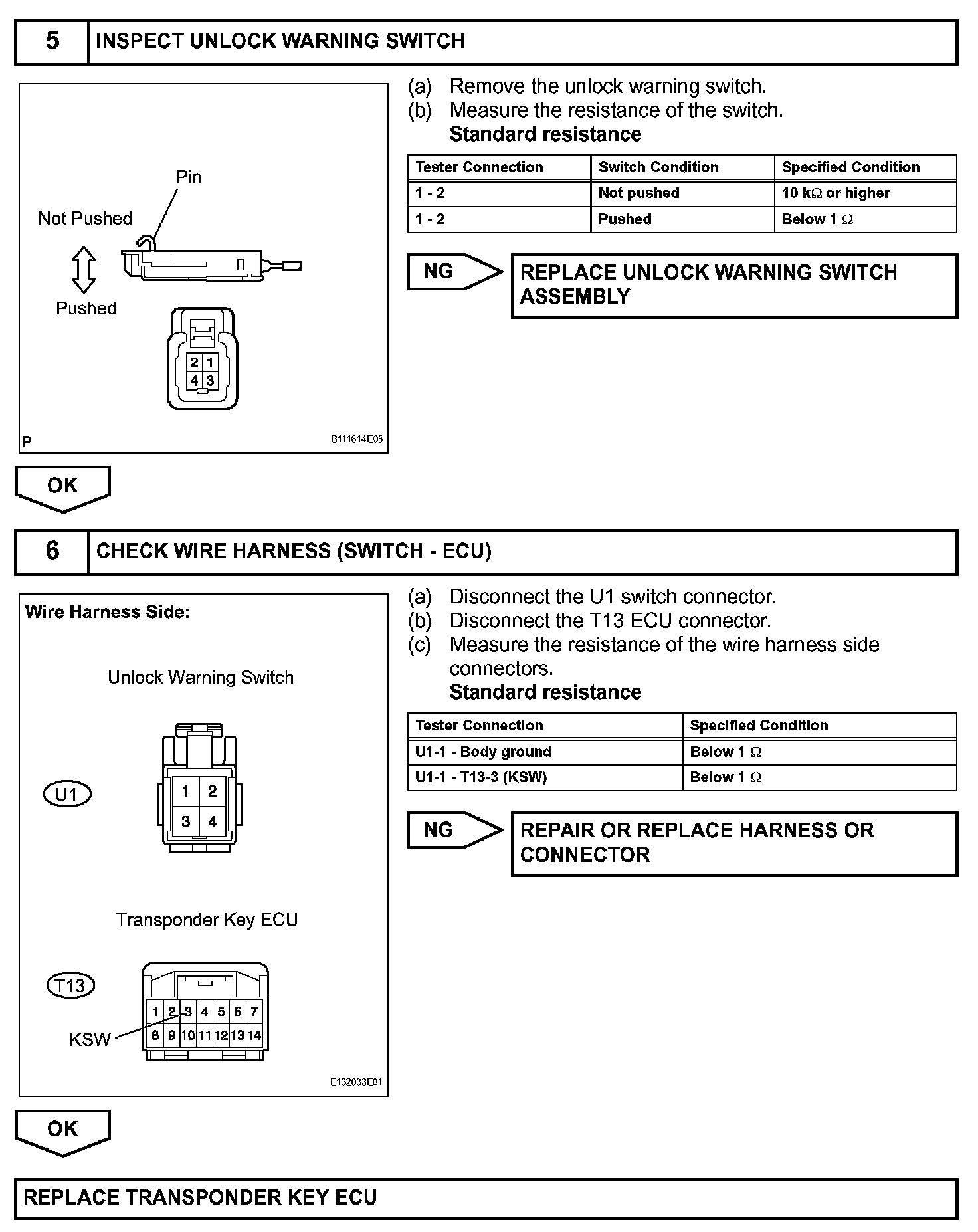 The transponder key ECU uses the unlock warning switch to detect when the key is in the ignition key cylinder, and transmits the detection as a signal to the theft warning ECU. When the door is locked with the ignition switch OFF and the key in the ignition key cylinder, the theft warning ECU transmits the LOCK signal. Then the UNLOCK signal is sent to the multiplex network door ECU front LH and RH. After those operations, the multiplex network front door ECU LH and RH drive the door lock motor.