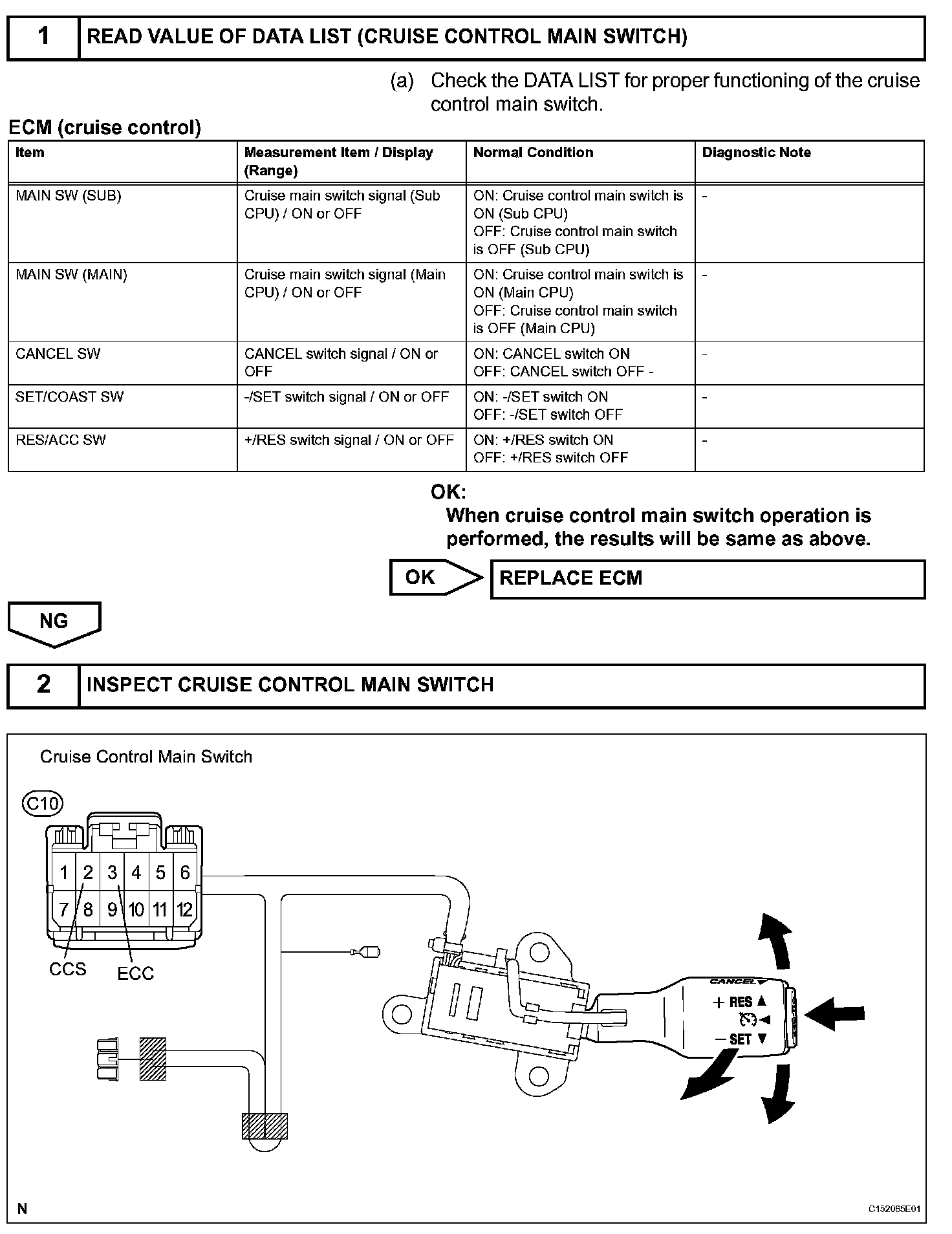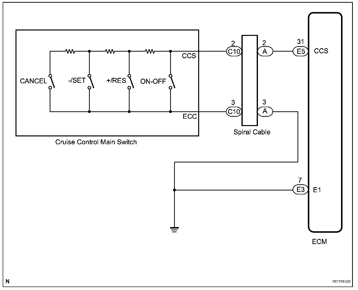 This circuit sends signals to the ECM depending on the cruise control main switch condition.
