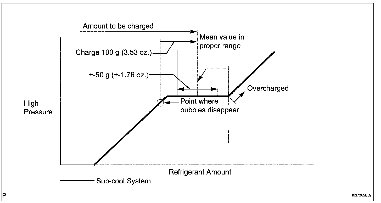 - Approximately 100 g (3.53 oz.) of refrigerant may need to be charged after bubbles disappear. The refrigerant amount should be checked by measuring its quantity, and not with the sight glass.