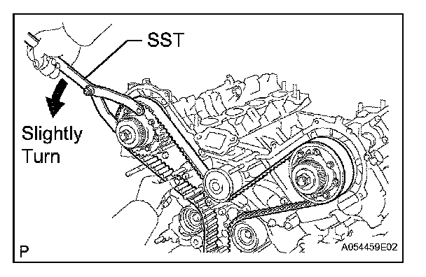 (d) Using SST, loosen the tension between the camshaft timing pulley (RH bank) and crankshaft timing pulley by slightly turning the camshaft timing pulley (RH bank) counterclockwise.