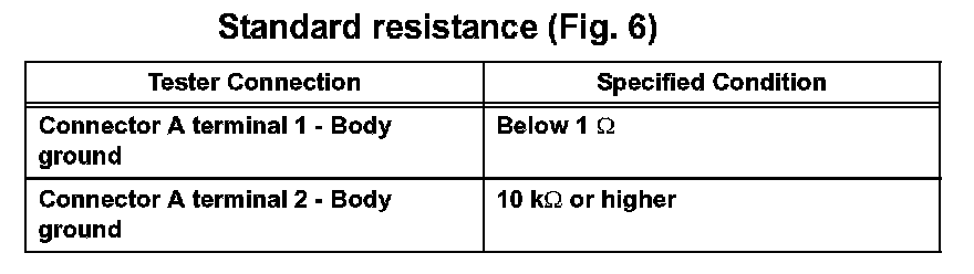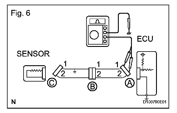 HINT: Measure the resistance while lightly shaking the wire harness vertically and horizontally. If the results match the examples above, a short circuit exists between terminal 1 of connector A and terminal 1 of connector C.