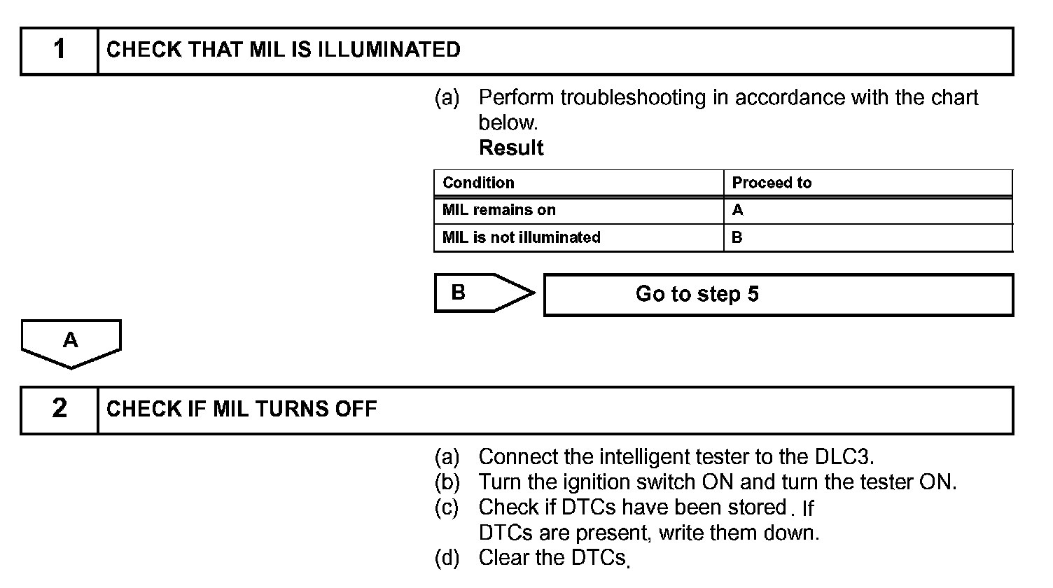 The MIL should be illuminated when the ignition switch is turned ON. If the MIL is always ON or OFF, use the intelligent tester and follow the procedures to determine the cause of the problem.
