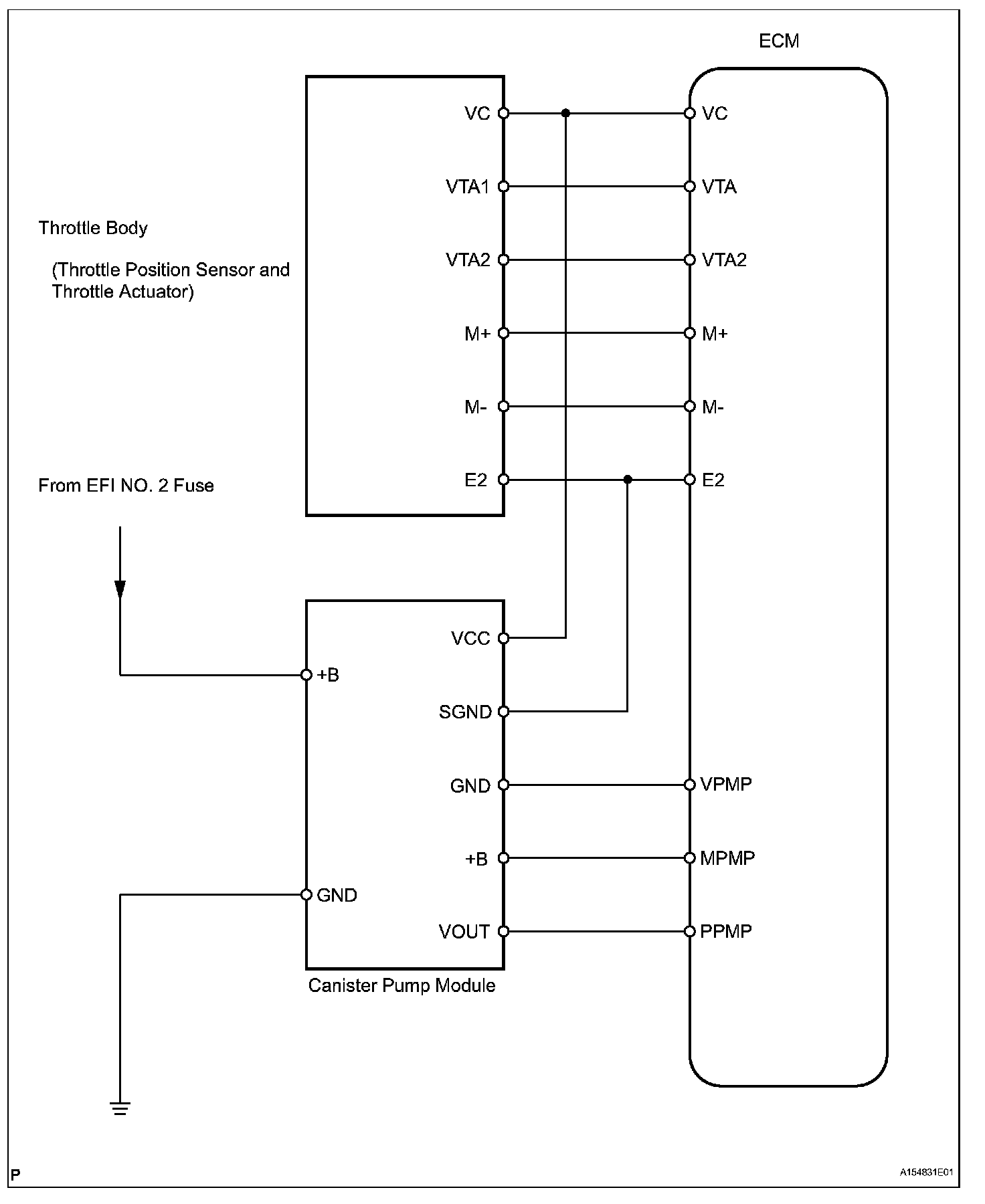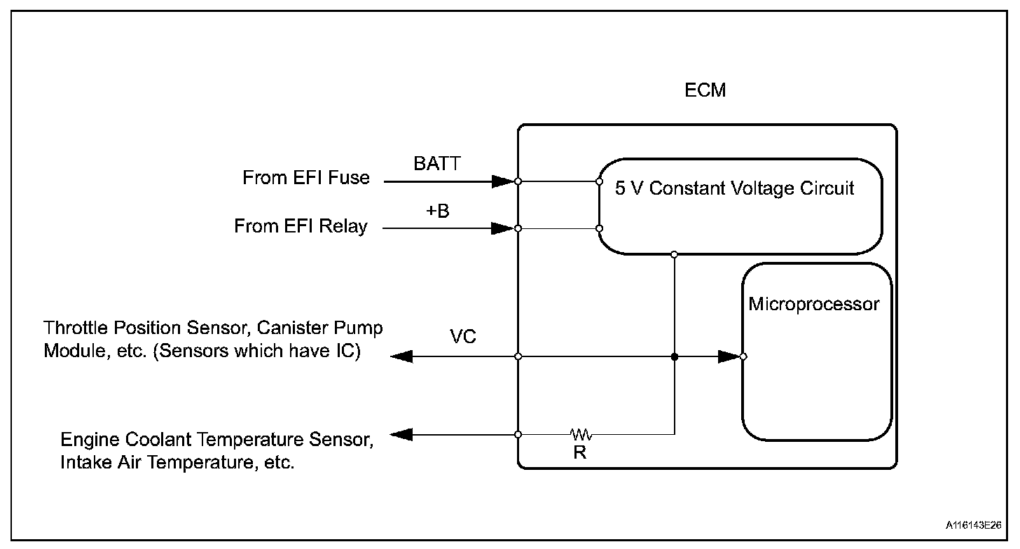 The ECM constantly generates 5 V power from the battery voltage supplied to the +B (BATT) terminal to operate the microprocessor. The ECM also provides this power to the sensors through the VC output circuit.