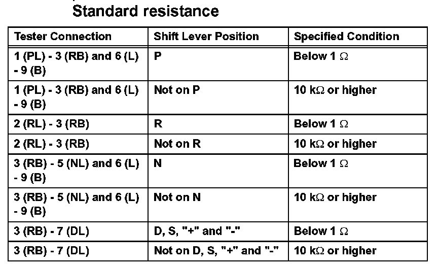 Measure the resistance of the park/neutral position switch when the shift lever is moved to each position.