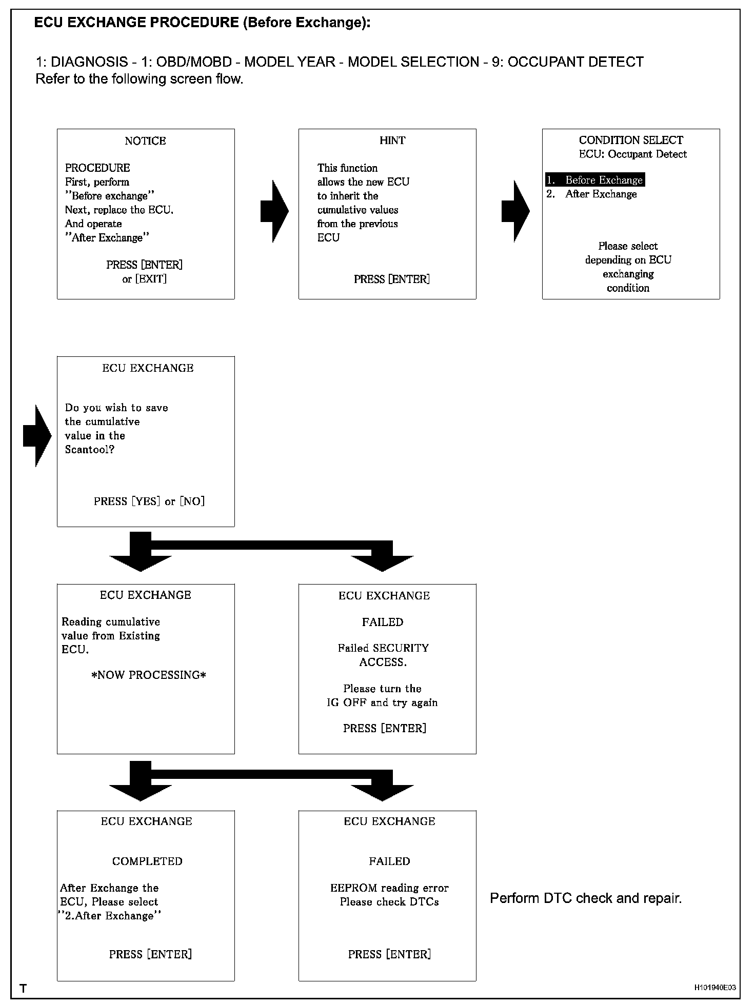 - ECU EXCHANGE procedure (Before Exchange) describes the procedure to save the data in the intelligent tester from the occupant classification ECU which has been installed on the vehicle. ECU EXCHANGE procedure (After Exchange) describes the procedure to load the data from the previous ECU, stored in the intelligent tester, into the new ECU.