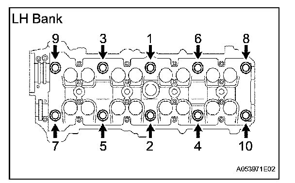 Install and uniformly tighten the 10 cylinder head bolts, and plate washers in the sequence shown in the illustration.
