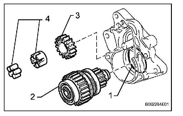 e. Place a new O-ring (1), the starter clutch (2), idler gear (3), and bearing (4), on the starter using.