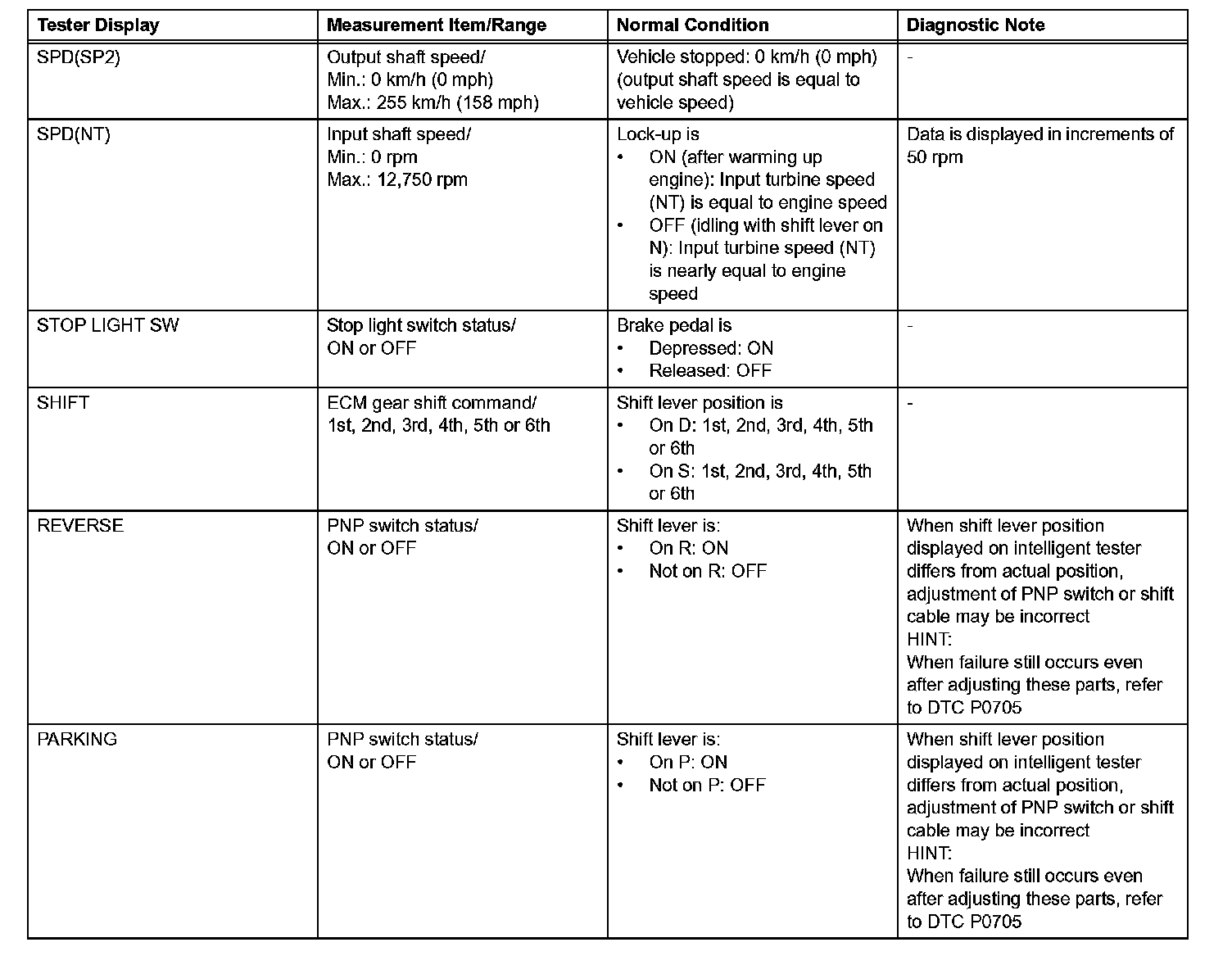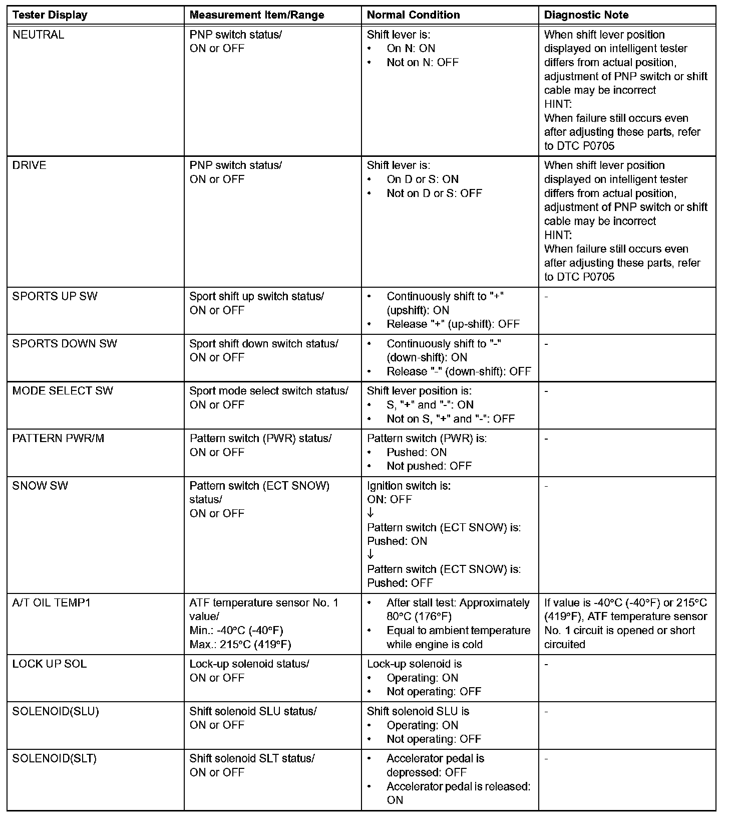 HINT: Using the intelligent tester's DATA LIST allows switch, sensor, actuator, and other item values to be read without removing any parts. Reading the DATA LIST early in troubleshooting is one way to save time.
