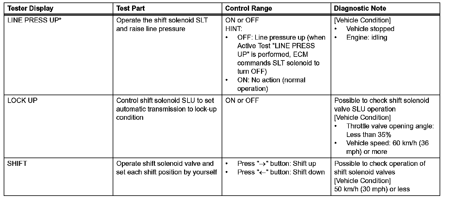 HINT: *: "LINE PRESS UP" in the ACTIVE TEST is performed to check the line pressure changes by connecting SST to the automatic transmission, which is used in the HYDRAULIC TEST as well. Hydraulic Test