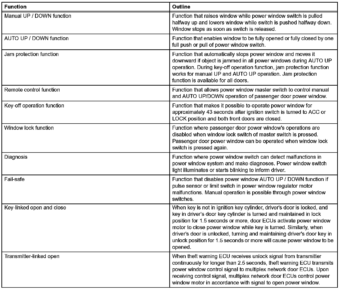 The main controls of this system are: the power window regulator master switch, which is built into the driver side door, and the power regulator switch, which is built into the passenger side door. Pressing the regulator switch on the master switch transmits a remote UP / DOWN signal to the multiplex network door ECU front RH (passenger door ECU) via the BEAN line.