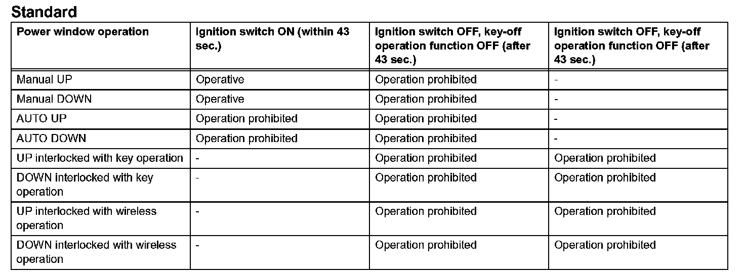 a. When an abnormality is detected in the limit switch and pulse sensor for operating the jam protection function (DTC: B1231, B1232, B1233, B1234), the following power window operations will be prohibited as a fail-safe.