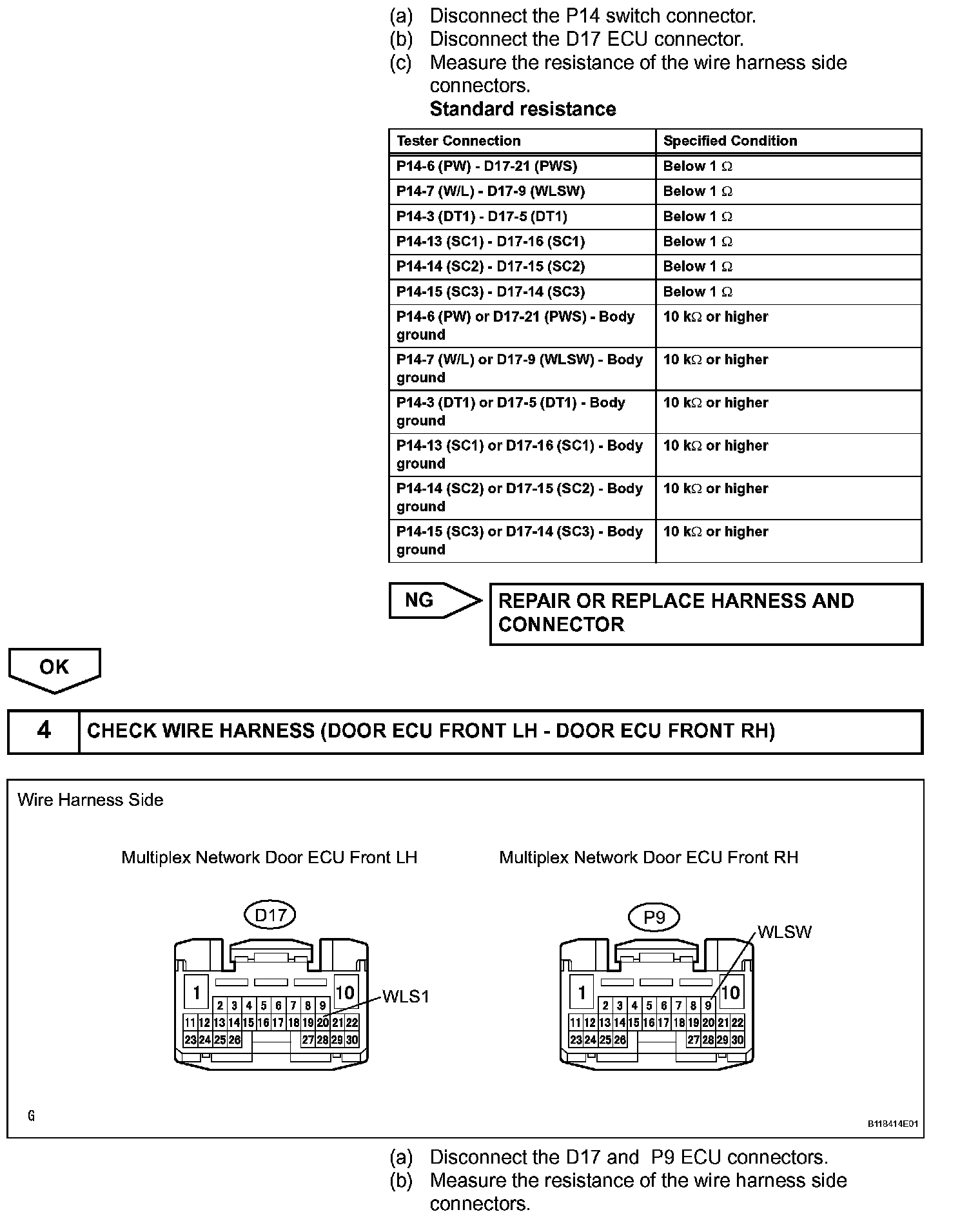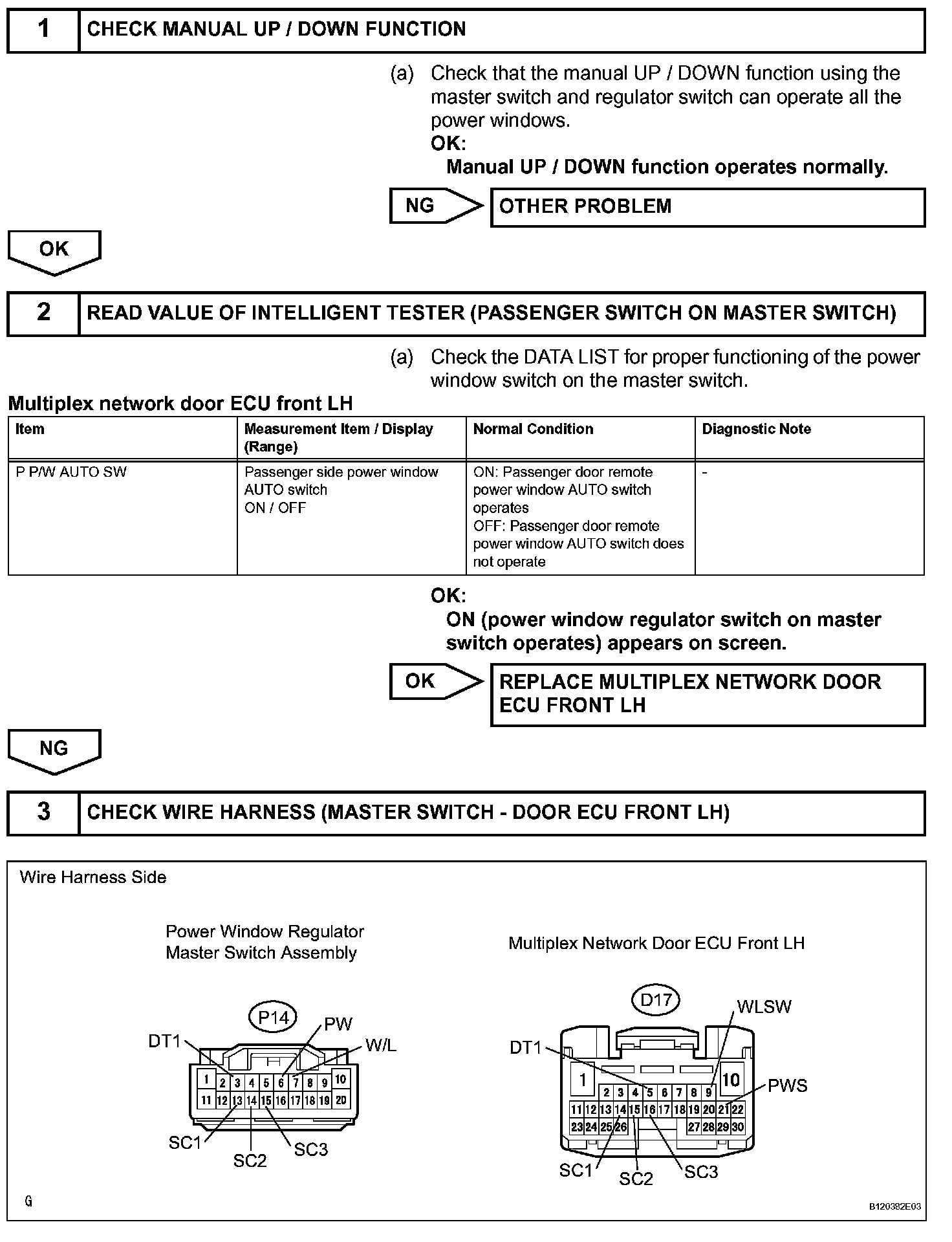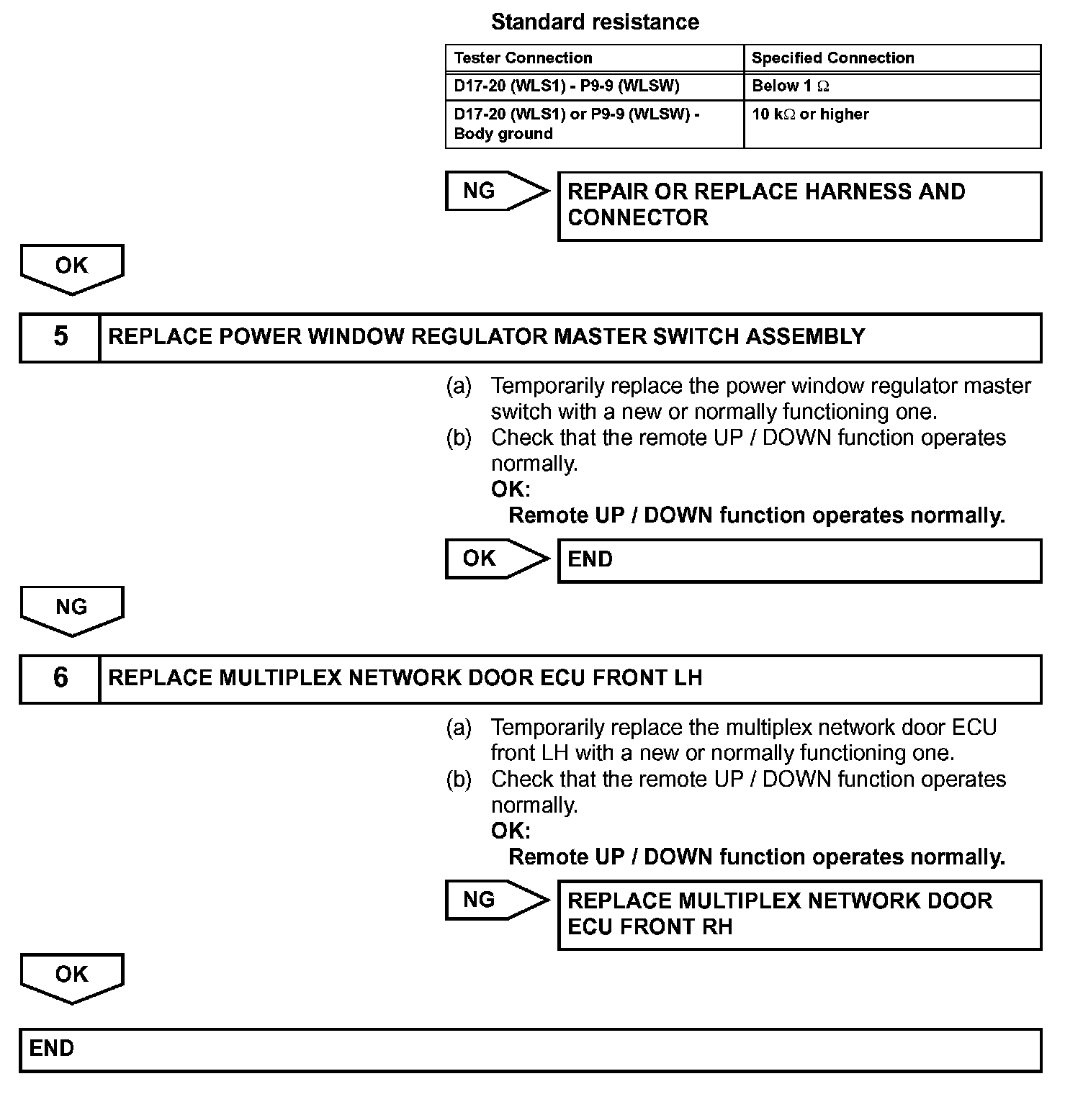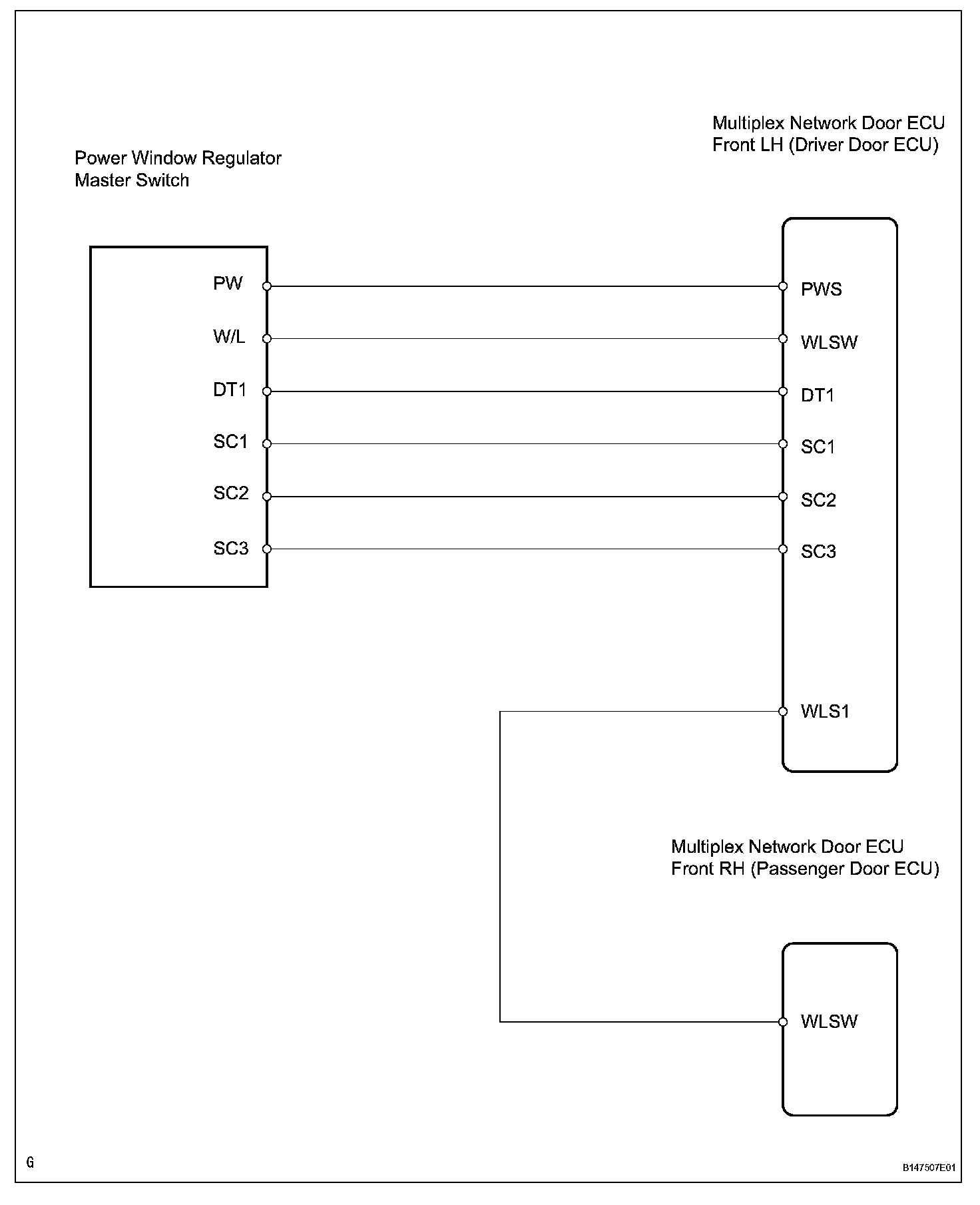 When the ignition switch is ON and the window lock switch is set to UNLOCK, the power window regulator master switch sends remote signals to the multiplex network door ECU front LH (driver door ECU), and the remote signals are then passed to the multiplex network door ECU front RH (passenger door ECU). The multiplex network door ECU front RH then activates the appropriate power window regulator motor.