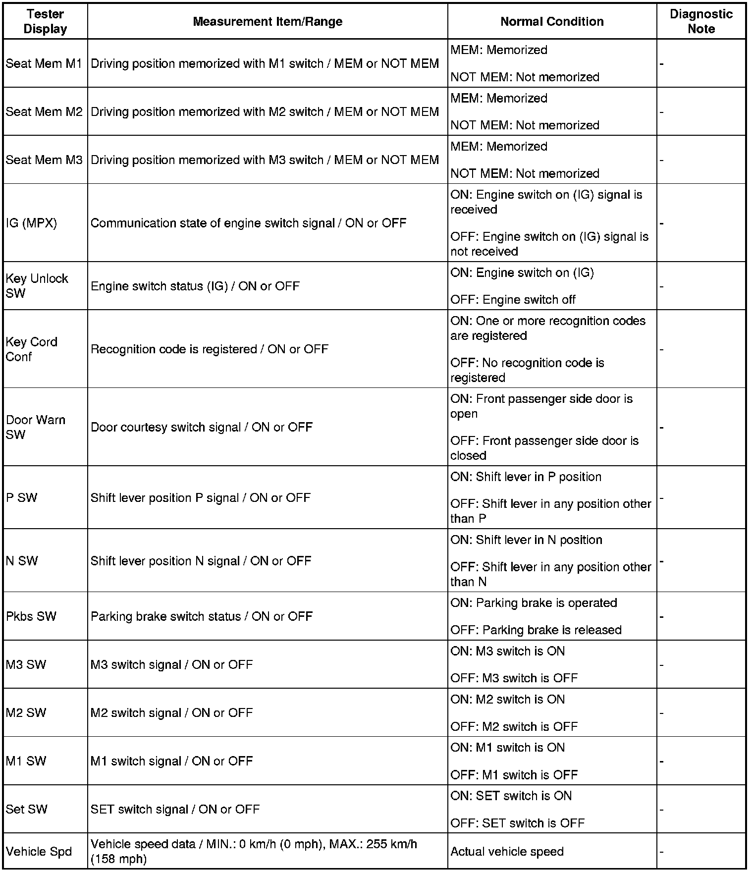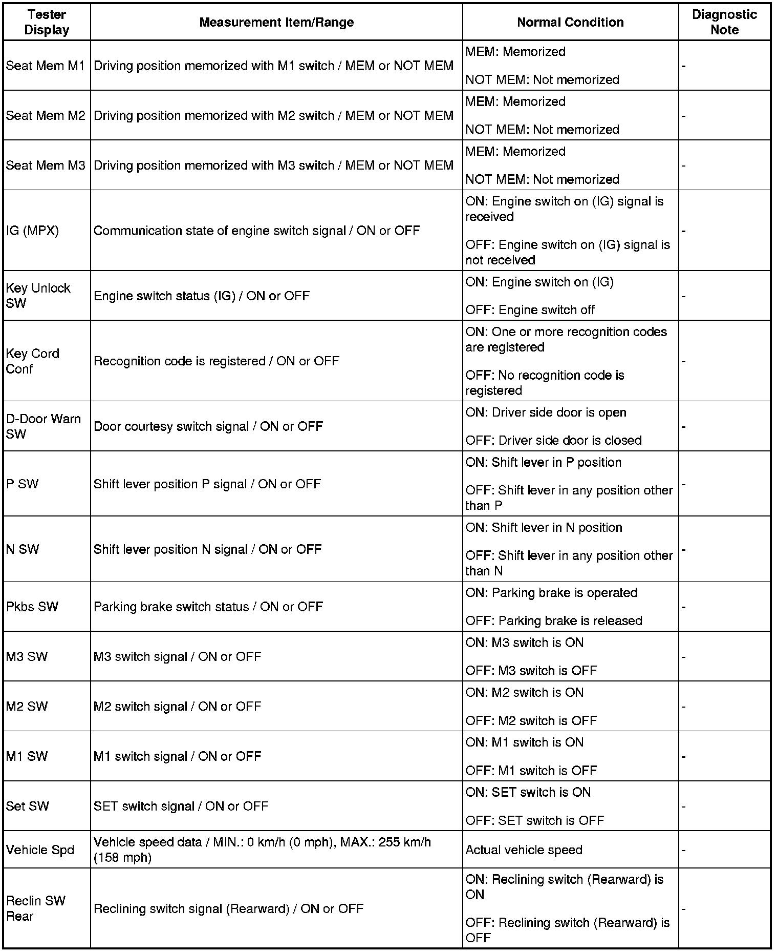 SEAT: FRONT POWER SEAT CONTROL SYSTEM (w/ Seat Position Memory System): DATA LIST / ACTIVE TEST