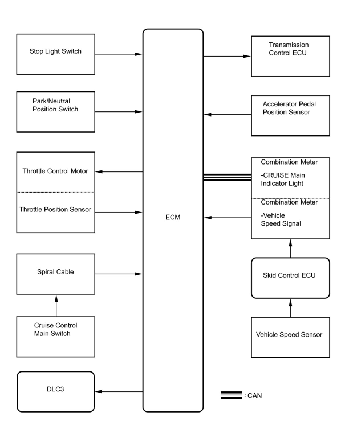 - The ECM compares the driving vehicle speed from the speed sensor with the stored vehicle speed set through the cruise control main switch. The ECM instructs the throttle valve motor of the throttle body assembly to close the valve when the driving speed is greater than the stored speed, and instructs it to open the valve when the driving speed is less than the stored speed.
