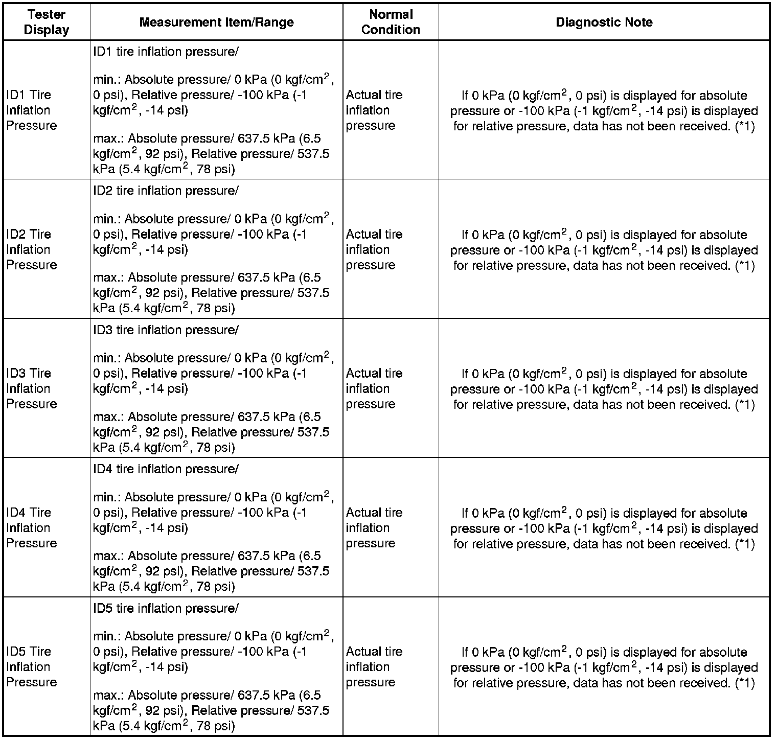 - The initialization is complete when the Data List "ID Tire Inflation Pressure" display shows the correct pressures.