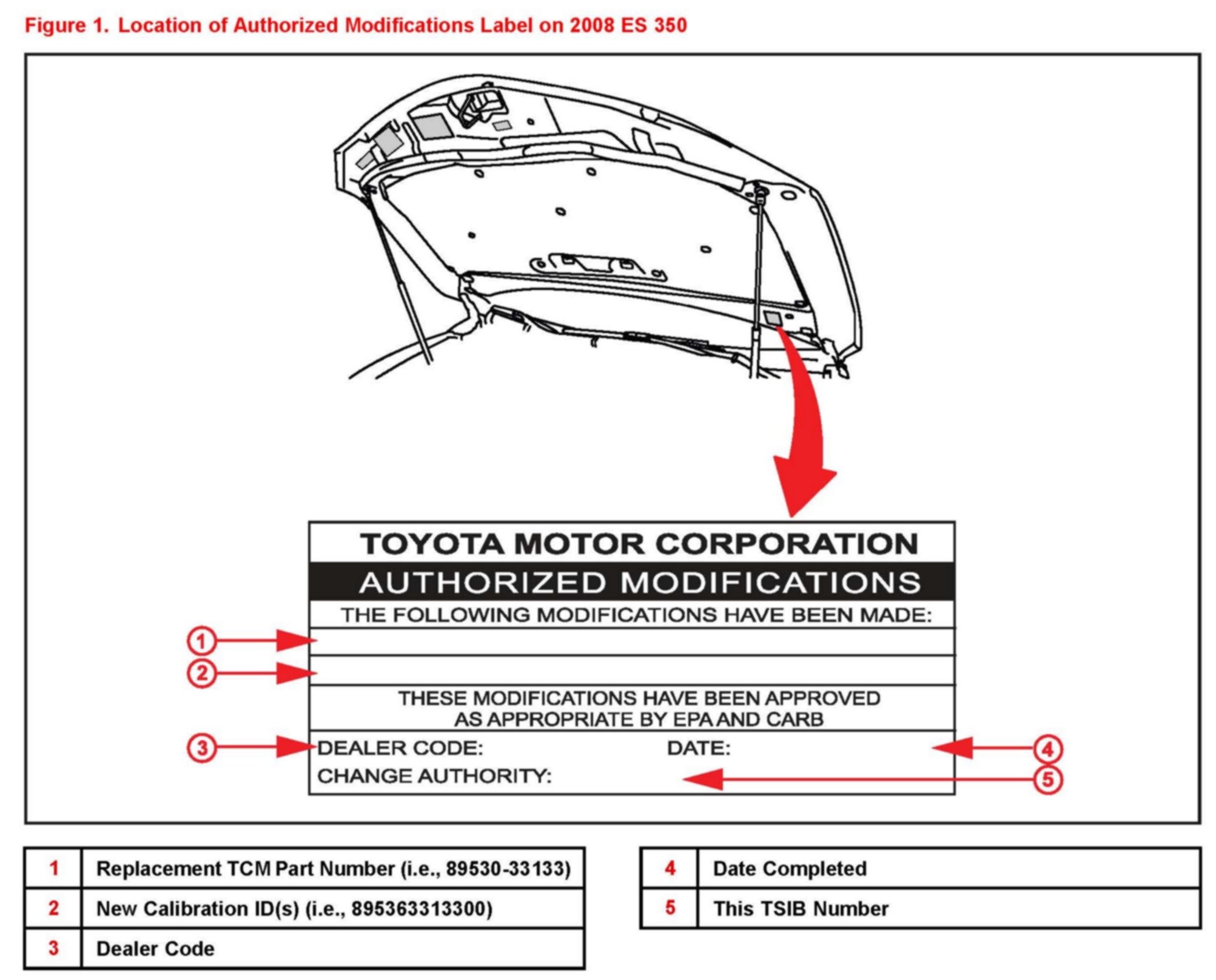 1. Check for the Authorized Modifications Label affixed to the vehicle in the location shown in Figure 1. Confirm if the TCM calibration has been updated. If the calibration ID listed is NOT the latest TCM calibration - go to step 2.