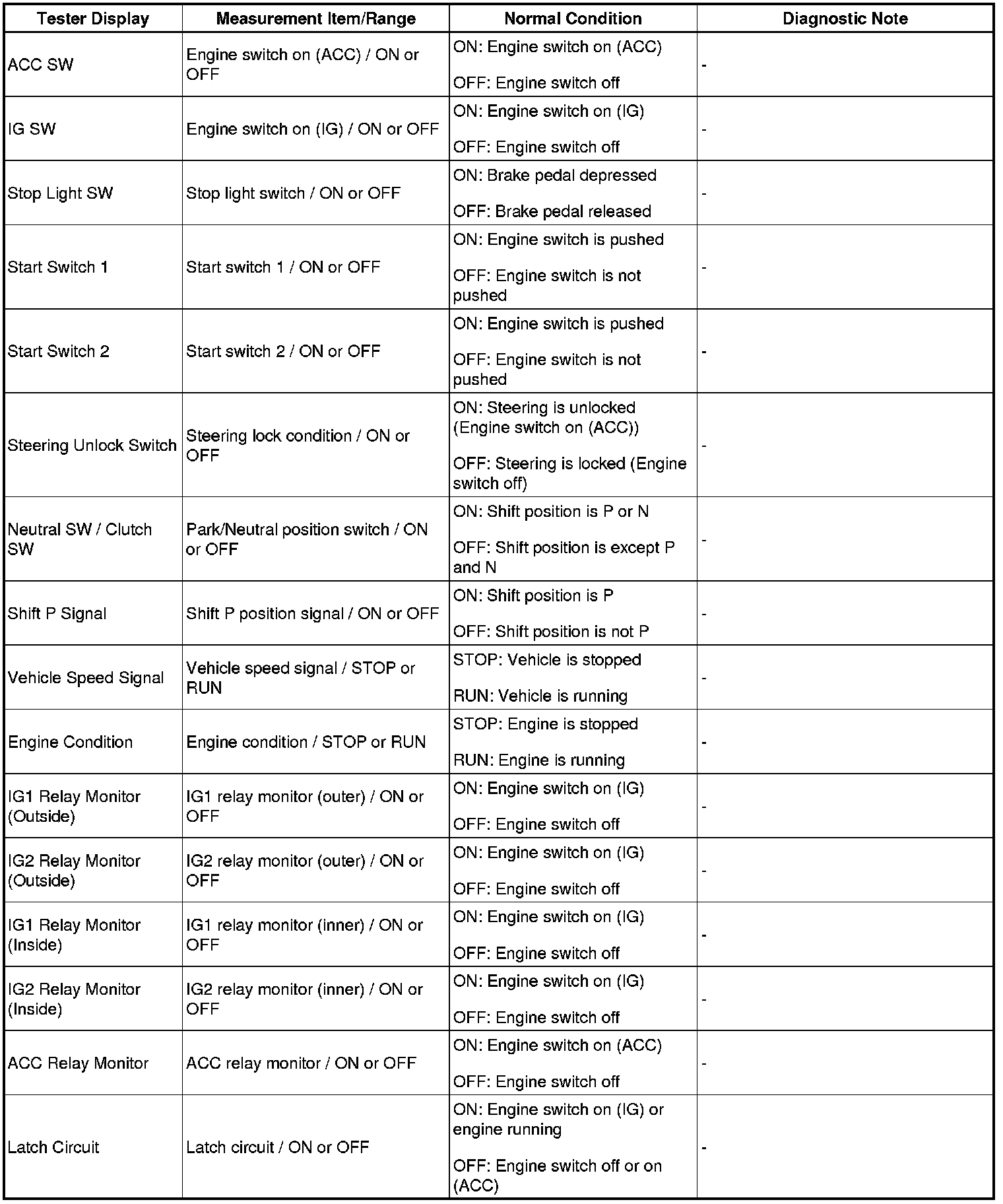 HINT: Using Techstream to read the Data List allows the values or states of switches, sensors, actuators and other items to be read without removing any parts. This non-intrusive inspection can be very useful as intermittent conditions or signals may be discovered before parts or wiring is disturbed. Reading the DATA LIST information early in troubleshooting is one way to save diagnostic time.