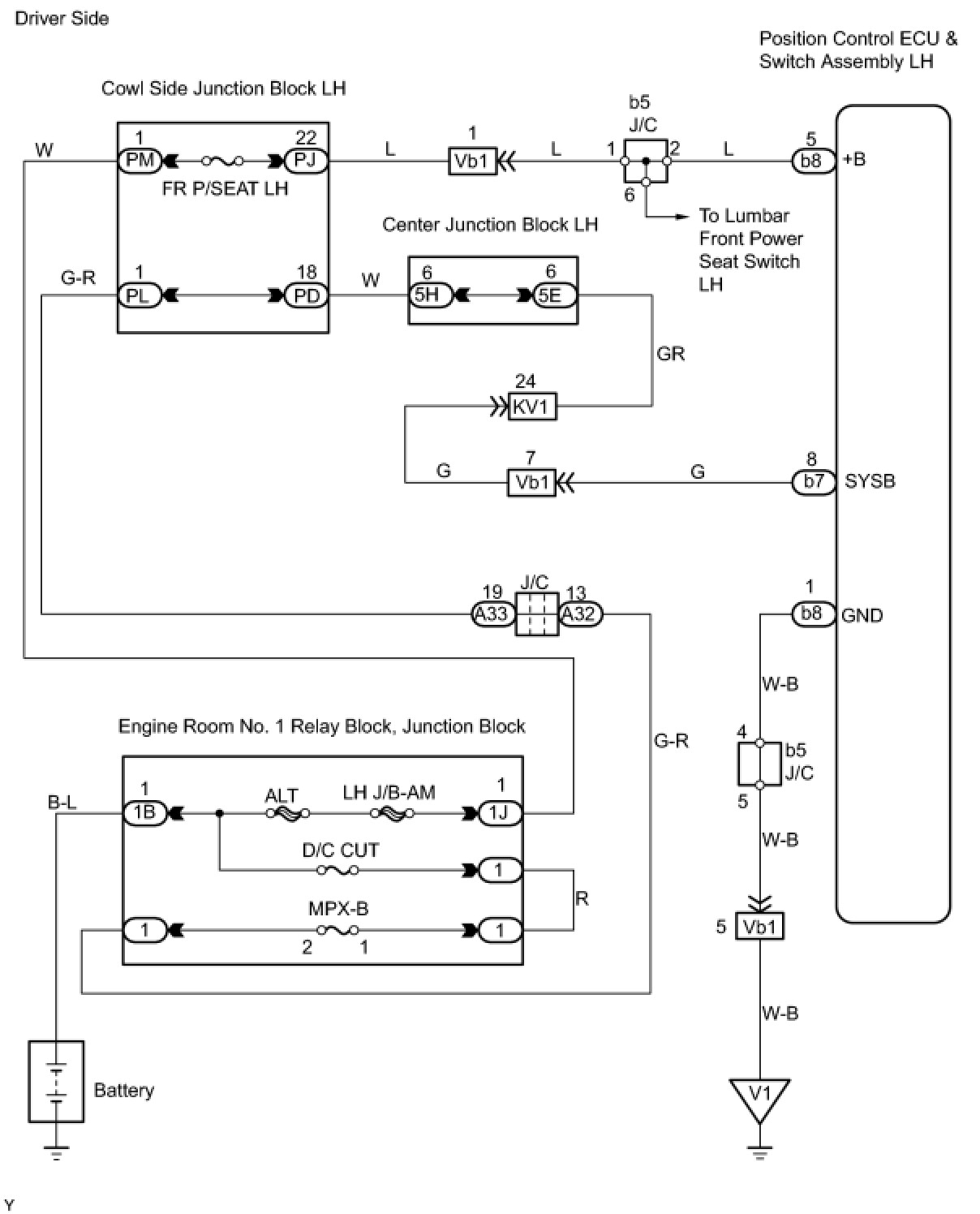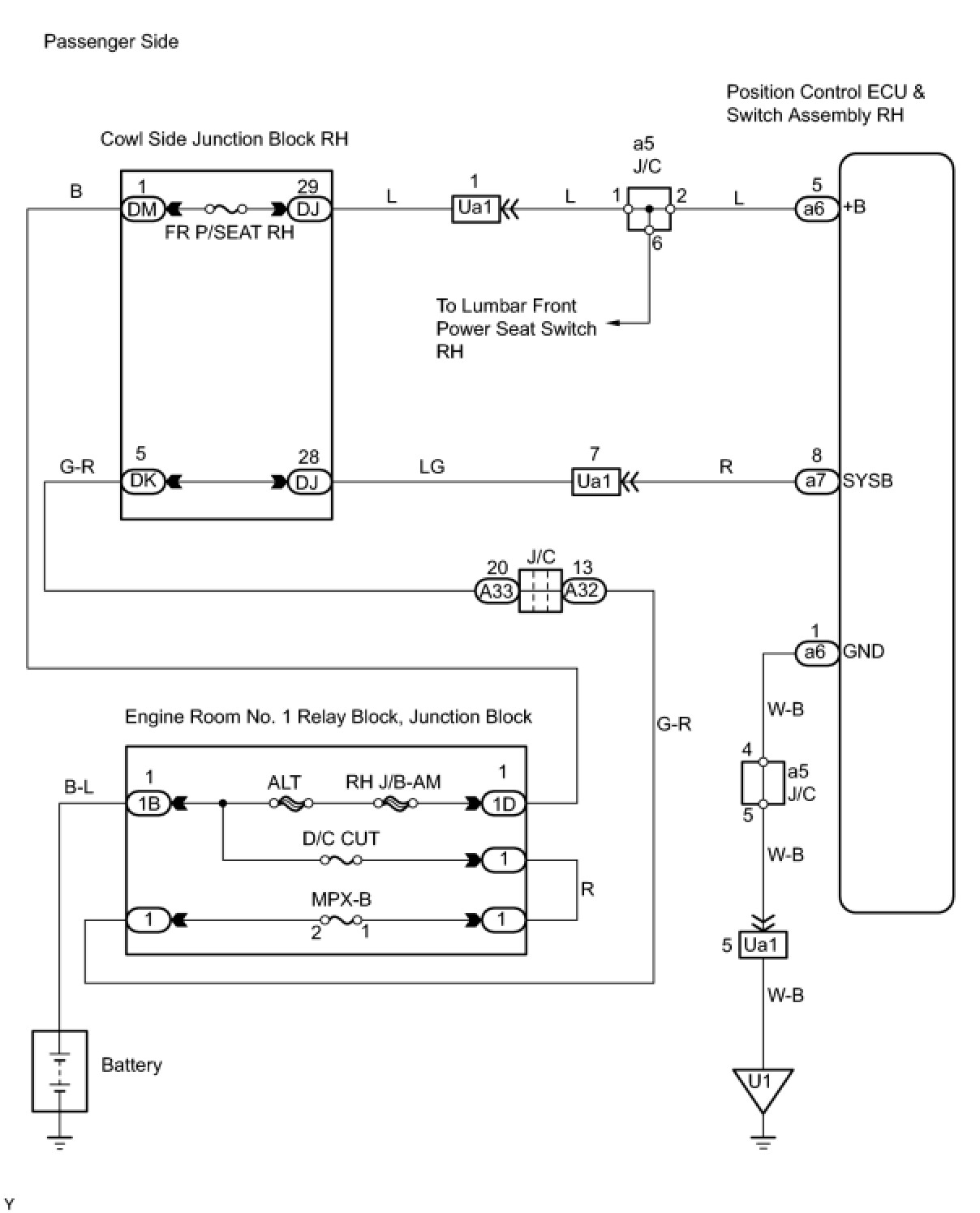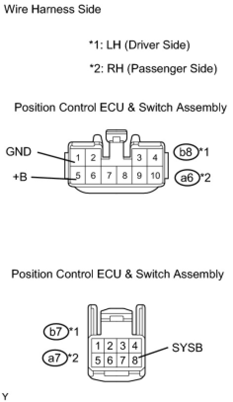 Signals of the front power seat switch are monitored by the position control ECU & switch assembly. The position control ECU & switch assembly then activates the driver and passenger side motors.