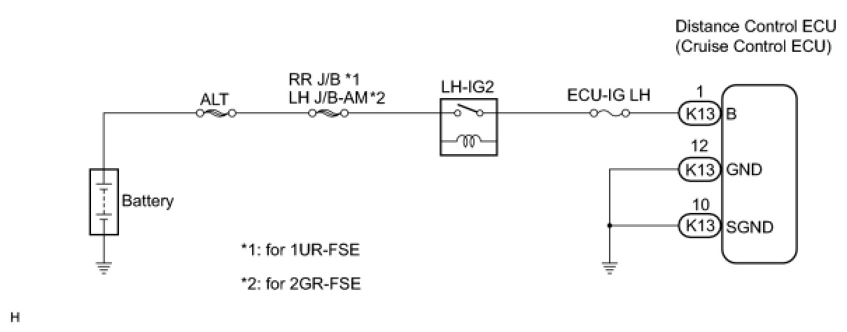 This circuit provides power to operate the distance control ECU (cruise control ECU). The distance control ECU determines information about the vehicle in front based on data from the radar sensor, and then decides how much acceleration and / or deceleration is needed to maintain the set distance. The distance control ECU also requests the skid control ECU to apply braking and sound the buzzer.