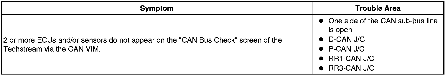 If 2 or more ECUs and/or sensors do not appear on the "CAN Bus Check" screen of the Techstream via the CAN VIM, one side of the CAN sub-bus line may be open. (One side of the CAN-H [sub-bus line] / CAN-L [sub-bus line] of the ECU and/or sensor is open.)