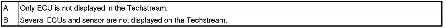 - Perform the following inspection for the ECUs (sensors) which are not displayed on the Techstream. If malfunction cannot be identified, then perform the following inspections for the ECUs (sensors) connected to the CAN communication.