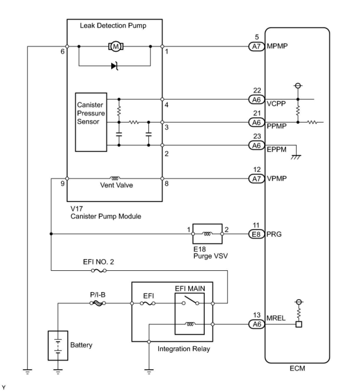 The leak detection pump creates negative pressure (vacuum) in the EVAP system and the pressure is measured. Finally, the ECM monitors for leaks from the EVAP system, and malfunctions in both the canister pump module and purge VSV, based on the EVAP pressure.