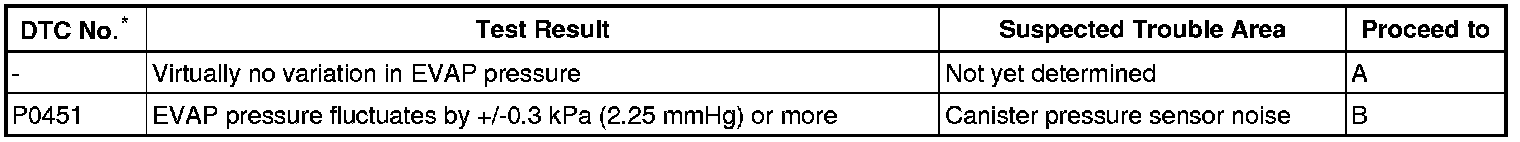 If any EVAP system DTCs are set, the malfunctioning area can be determined using the table below.