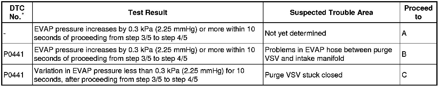 The vent valve is turned OFF (open) and the EVAP pressure is measured. If the variation in the pressure is less than 0.5 kPa (3.75 mmHg), the ECM interprets this as the purge VSV being stuck closed, illuminates the MIL and sets DTC P0441 (2 trip detection logic).