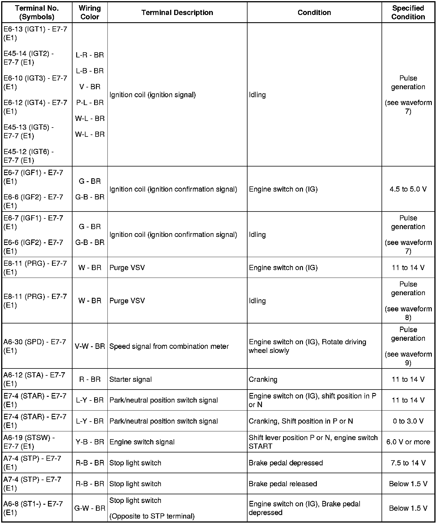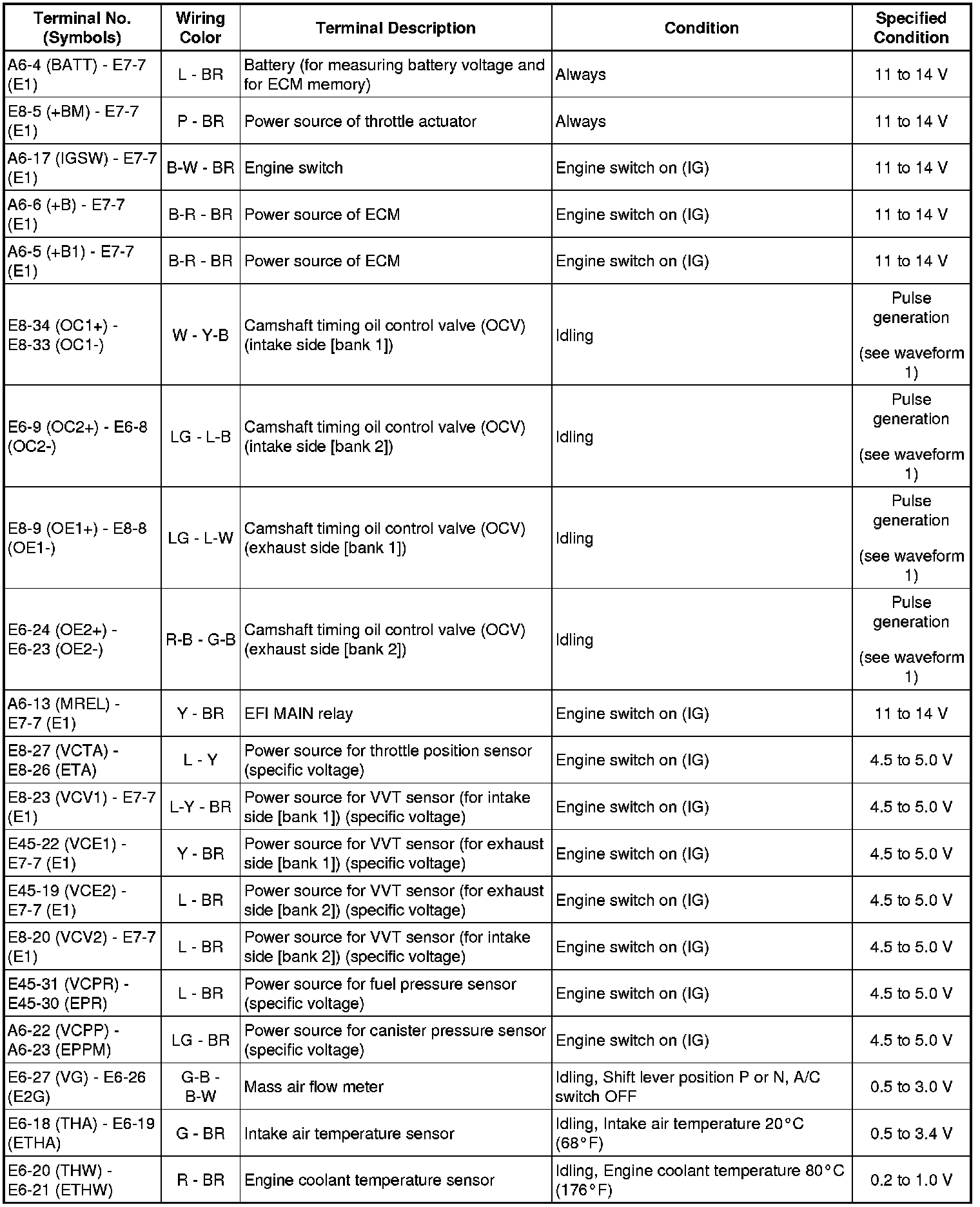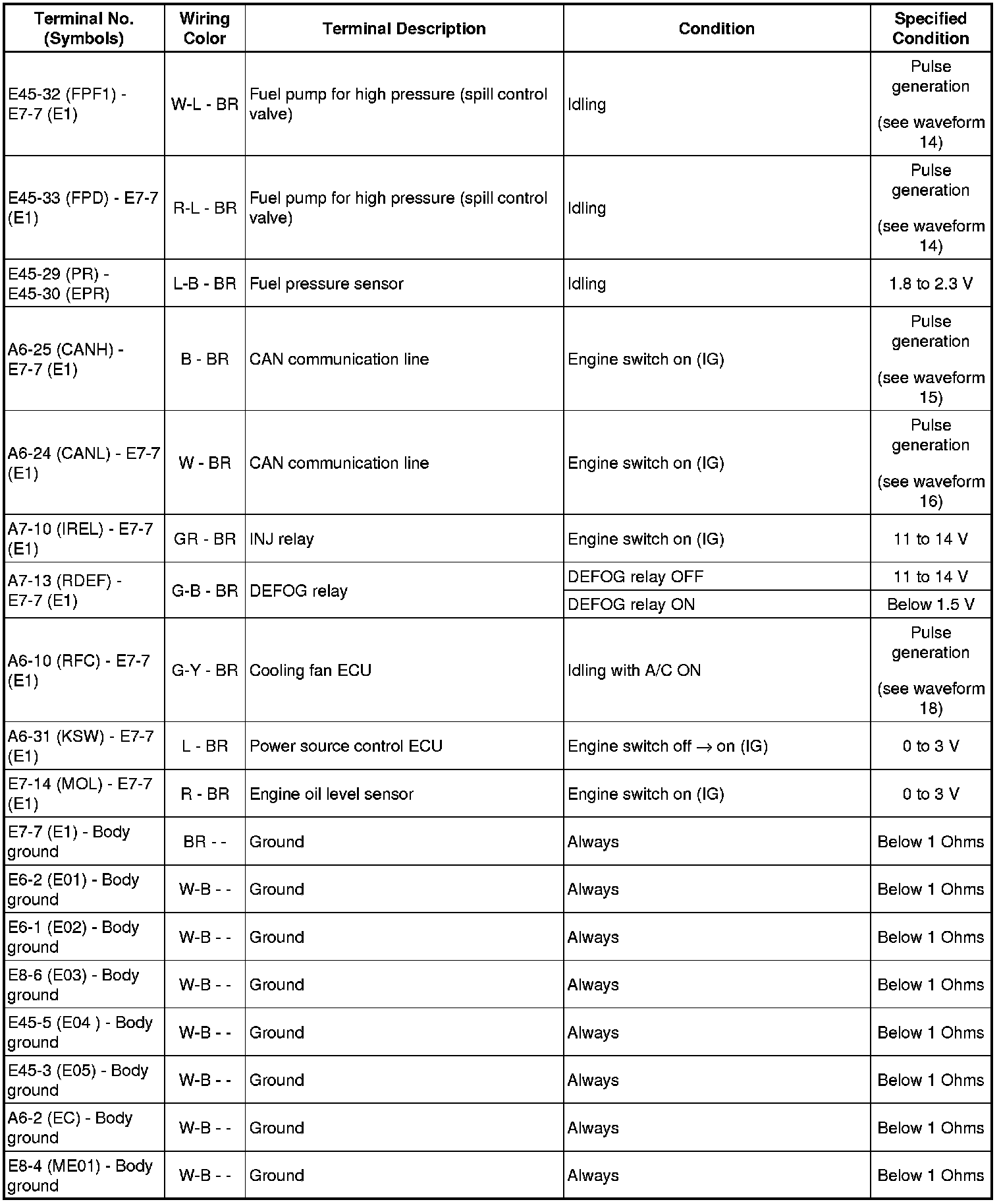 The standard normal voltage between each pair of the ECM terminals is shown in the table below. The appropriate conditions for checking each pair of the terminals are also indicated. The result of checks should be compared with the standard normal voltage for that pair of terminals, displayed in the Specified Condition column. The illustration above can be used as a reference to identify the ECM terminal locations.