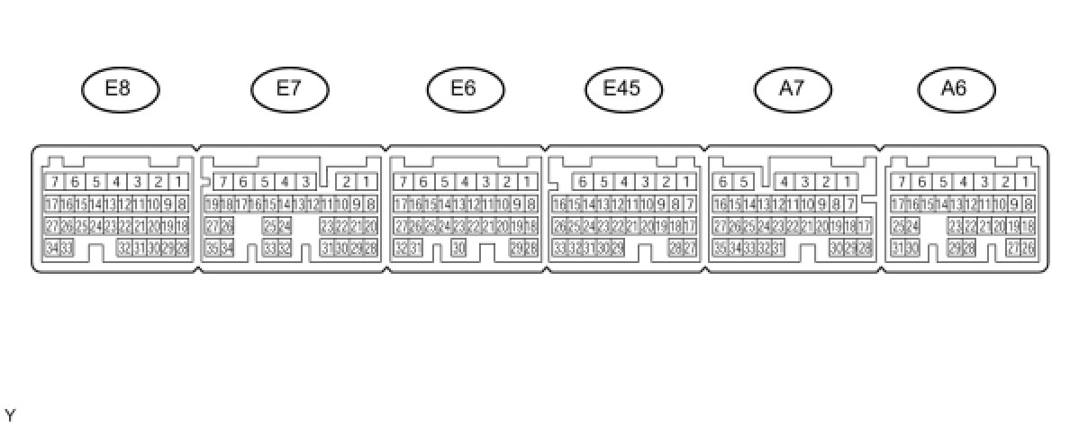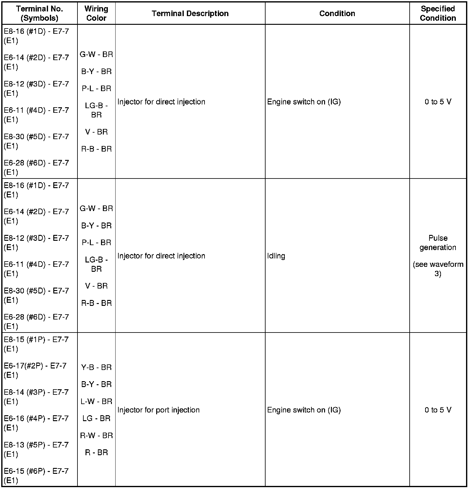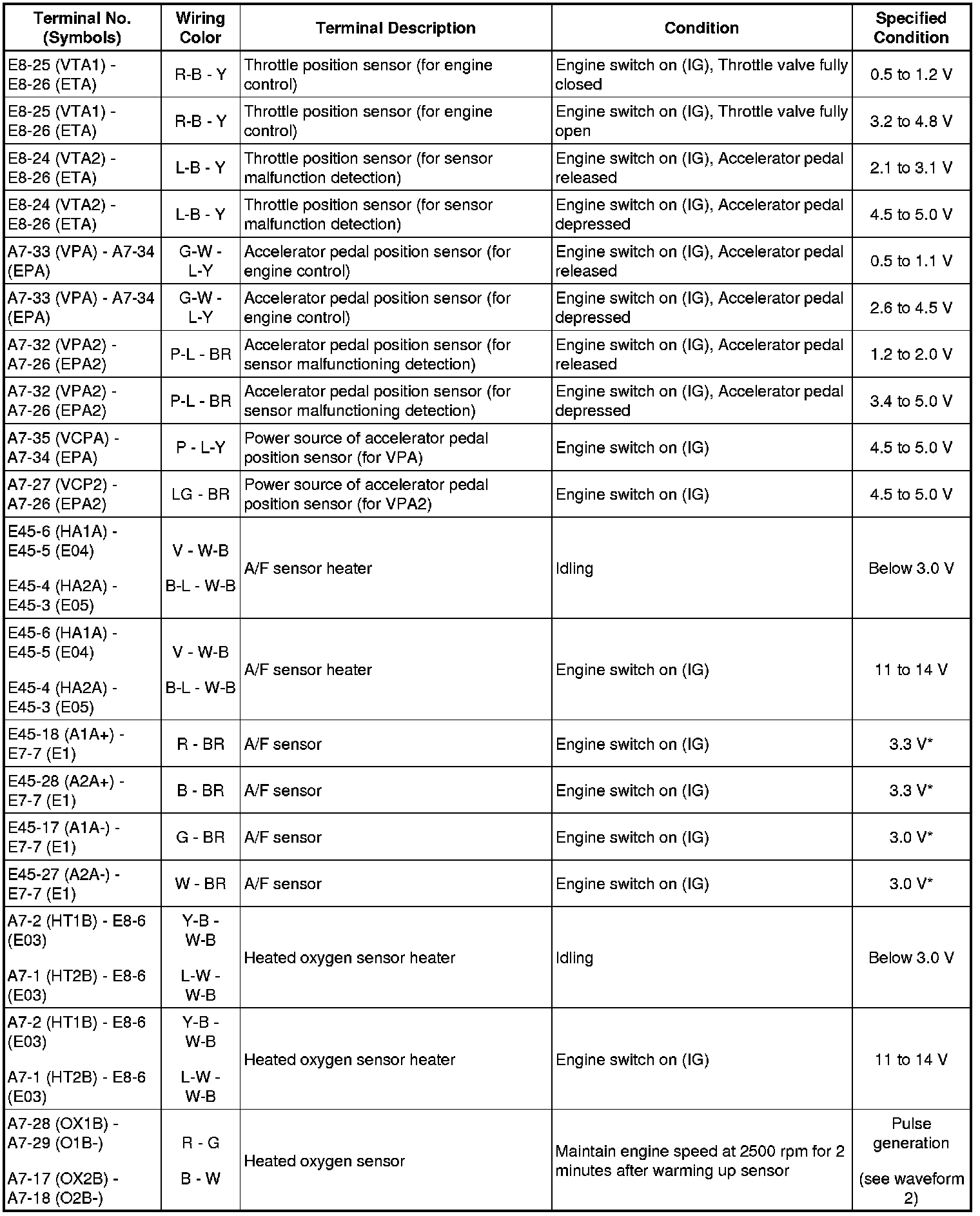 The standard normal voltage between each pair of the ECM terminals is shown in the table below. The appropriate conditions for checking each pair of the terminals are also indicated. The result of checks should be compared with the standard normal voltage for that pair of terminals, displayed in the Specified Condition column. The illustration above can be used as a reference to identify the ECM terminal locations.