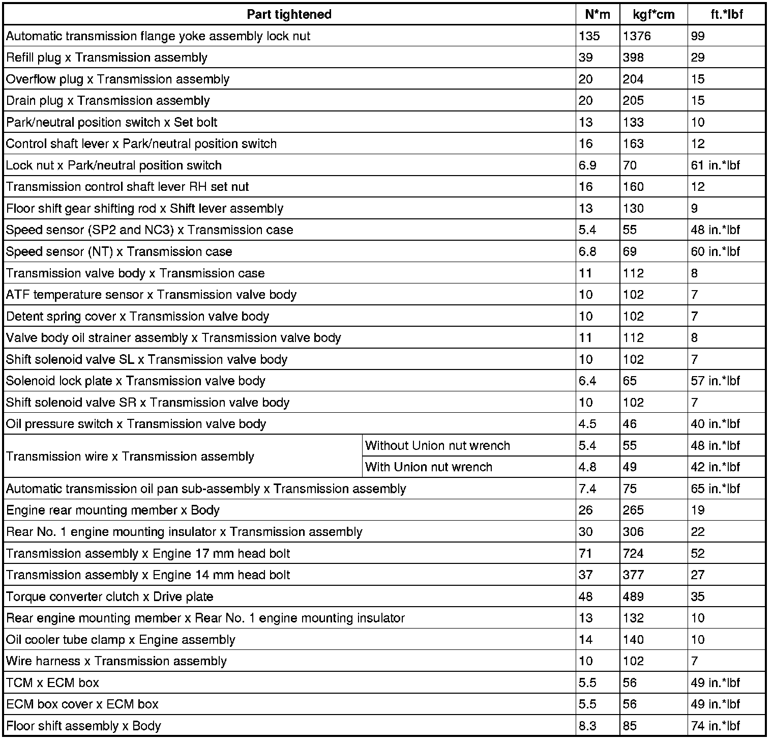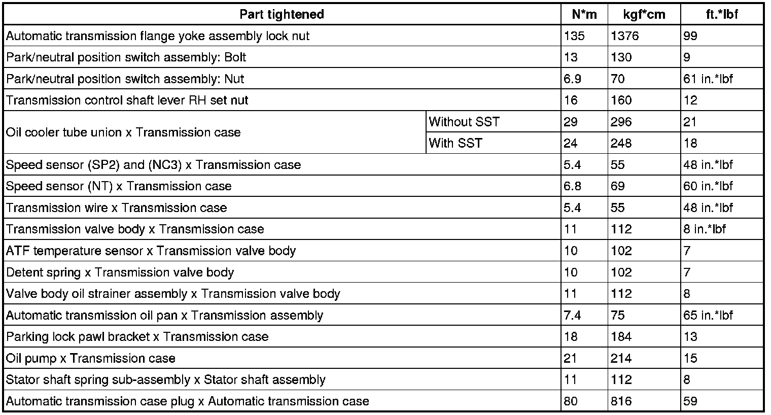 SERVICE SPECIFICATIONS: AA80E AUTOMATIC TRANSMISSION: TORQUE SPECIFICATIONS