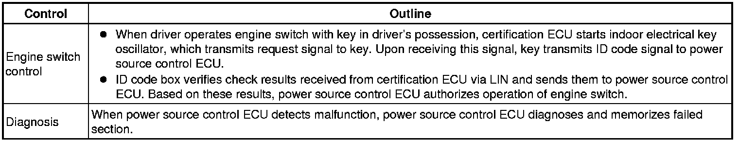 (a) The push-button start uses a push-type engine switch, which the driver can operate by merely carrying the key. This system consists primarily of the power source control ECU, engine switch, ID code box, steering lock ECU, key, ACC relay, IG1 relay, IG2 relay and certification ECU. The power source control ECU controls the system. This function operates in cooperation with the smart access system. The table below shows the transition of the engine switch, which depends on whether the brake pedal is depressed or released.