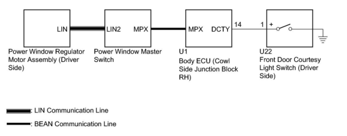 - When the driver door has not been opened, each door power window regulator motor can control its power window operation for approximately 45 seconds after the engine switch is turned off (key is removed) by receiving operation permission signals from the body ECU. However, when approximately 45 seconds have elapsed, or the driver door or front passenger side door is opened within approximately 45 seconds of the engine switch being turned off (key is removed), the power window regulator motor stops operating.