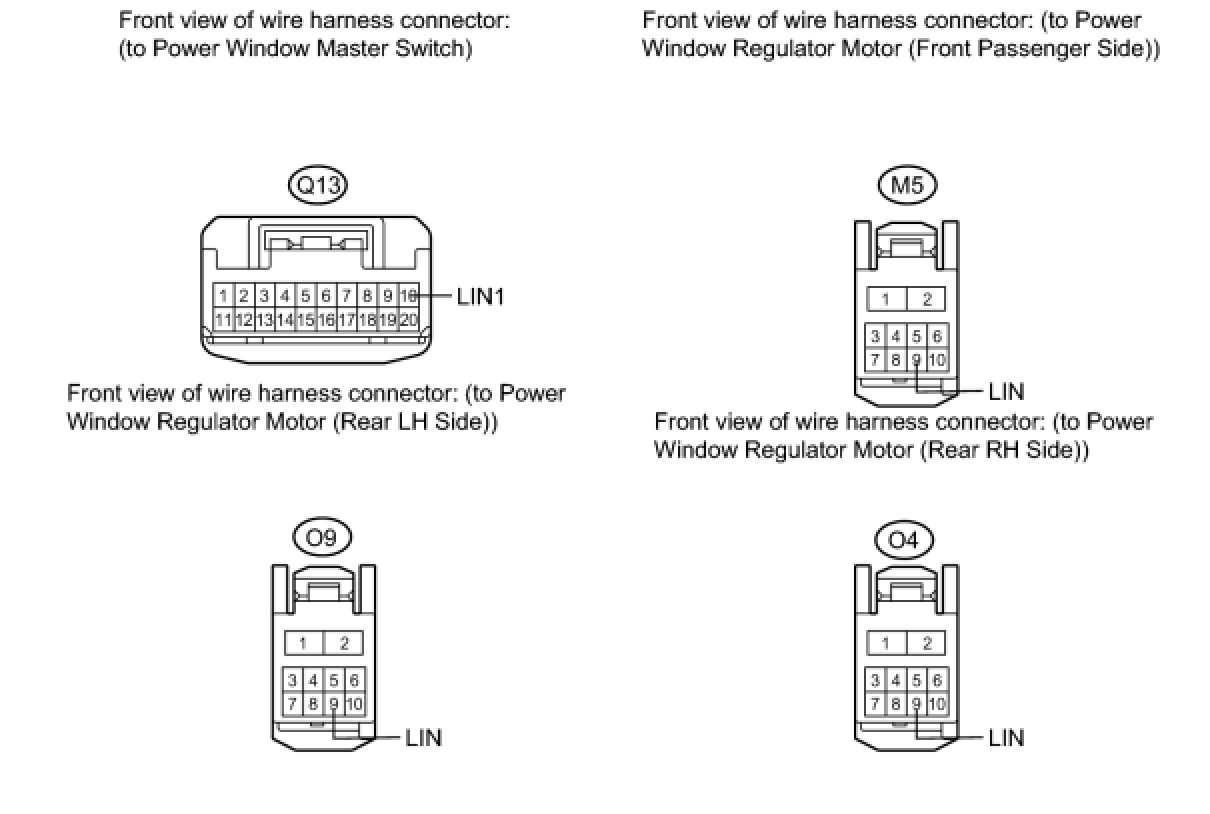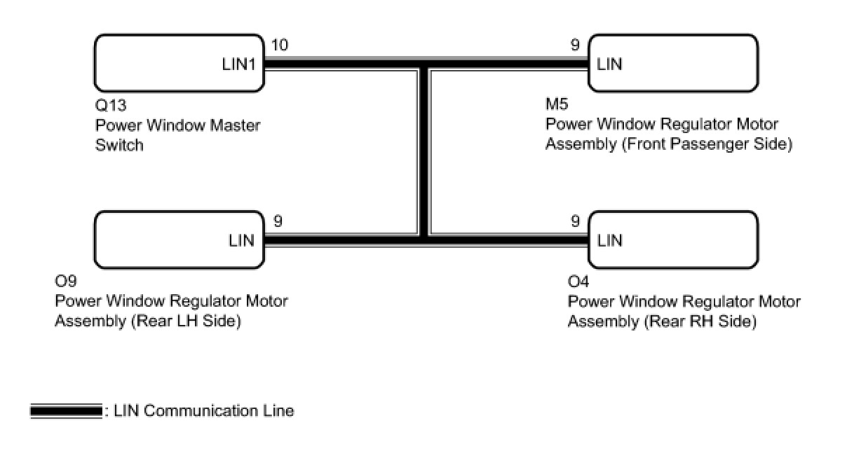 When the engine switch on (IG) and the window lock switch is OFF, the power window master switch sends remote up / down signal to each power window regulator motor via the LIN communication line.