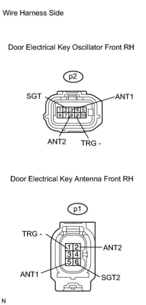 When an ID code from the door electrical key oscillator front RH matches an ID code from the key, the multiplex network door ECU front RH (front passenger door ECU) outputs a SEL signal (Lo when output) to the door electrical key oscillator front RH, activates the touch sensor inside the outside door handle, and enters unlock standby mode. When the touch sensor is touched, the door electrical key oscillator front RH sends a SENS signal (Lo when output) to the multiplex network door ECU front RH (front passenger door ECU) and the multiplex network door ECU front RH (front passenger door ECU) sends an unlock signal to the front passenger side door lock.