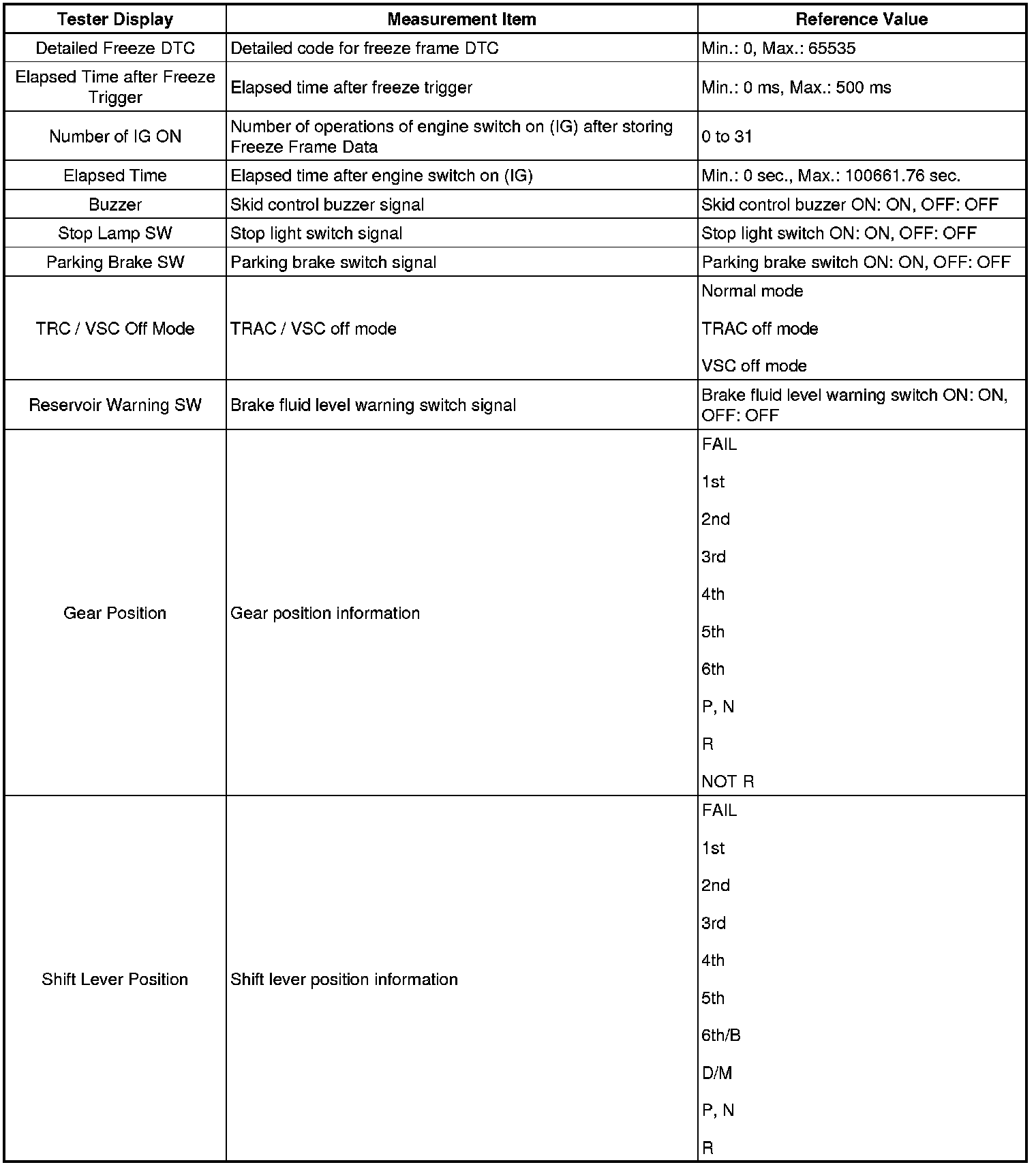 (a) If a DTC is detected when the ABS, BA, TRAC or VSC operates, the skid control ECU stores the current vehicle (sensor) state as Freeze Frame Data.
