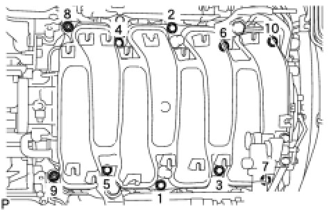 Intake ManifoldTemporarily install the intake manifold with the 2 nuts and 8 bolts. Then tighten the 2 nuts and 8 bolts uniformly in the order shown in the illustration.